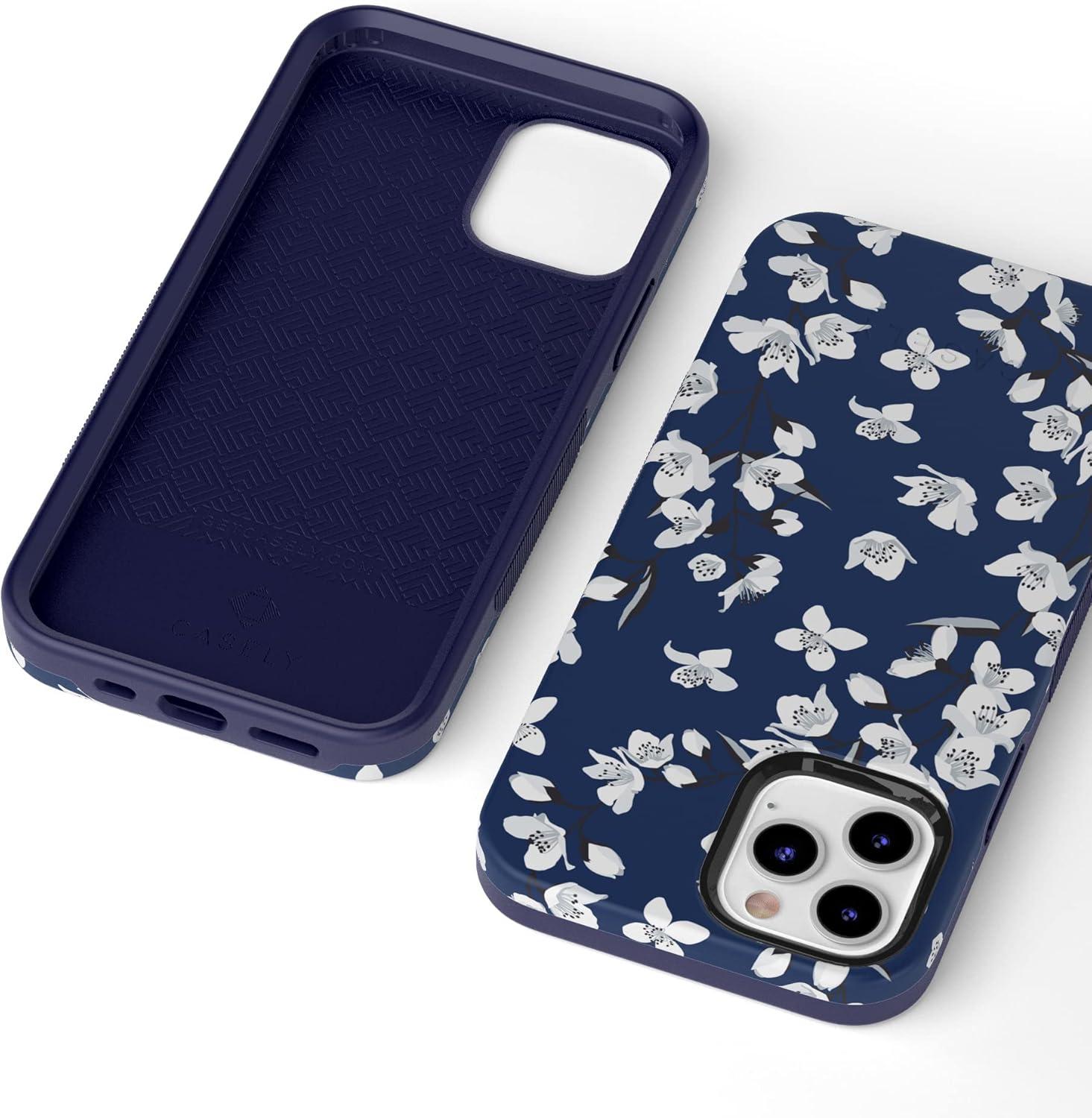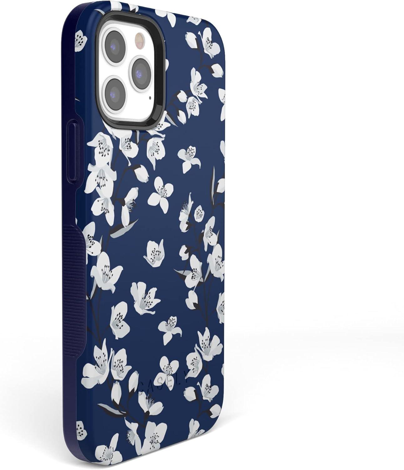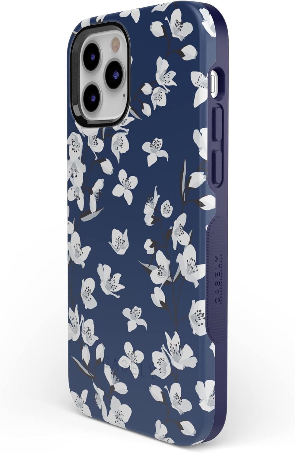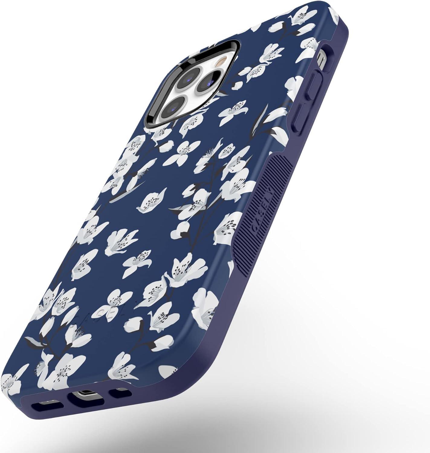 Casely iPhone 12/12 Pro Case | Tropical Dreams | Pura Vida | Compatible with MagSafe | Bold Protective Design(Navy Cherry Blossom Floral)