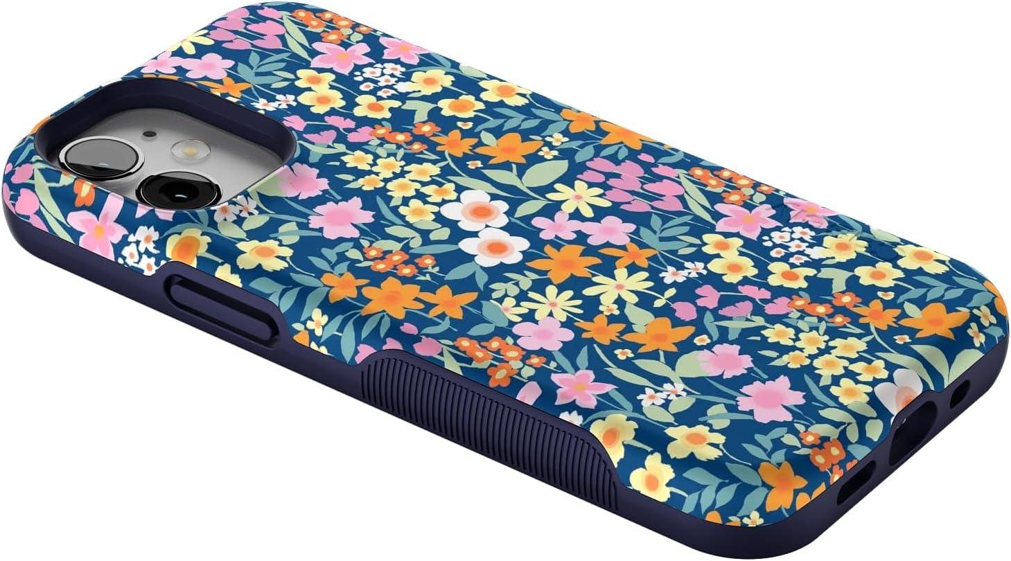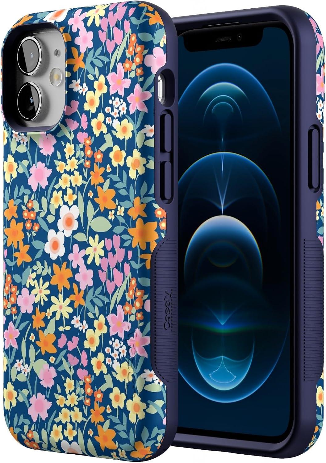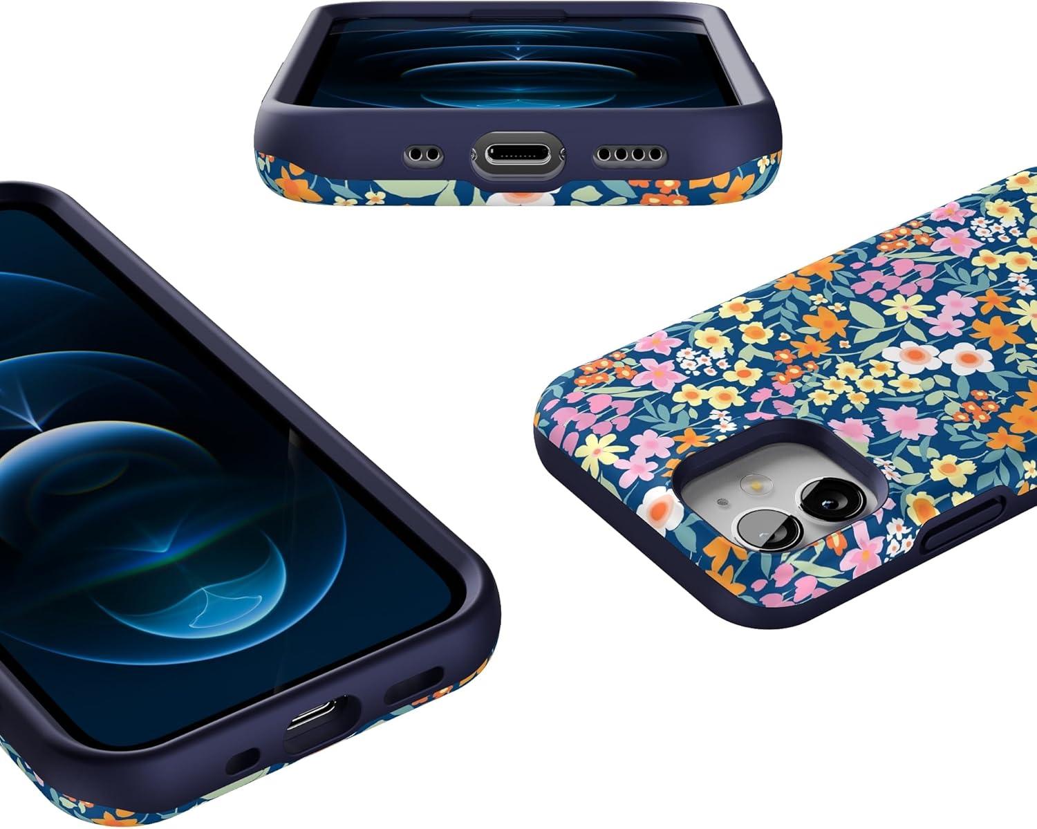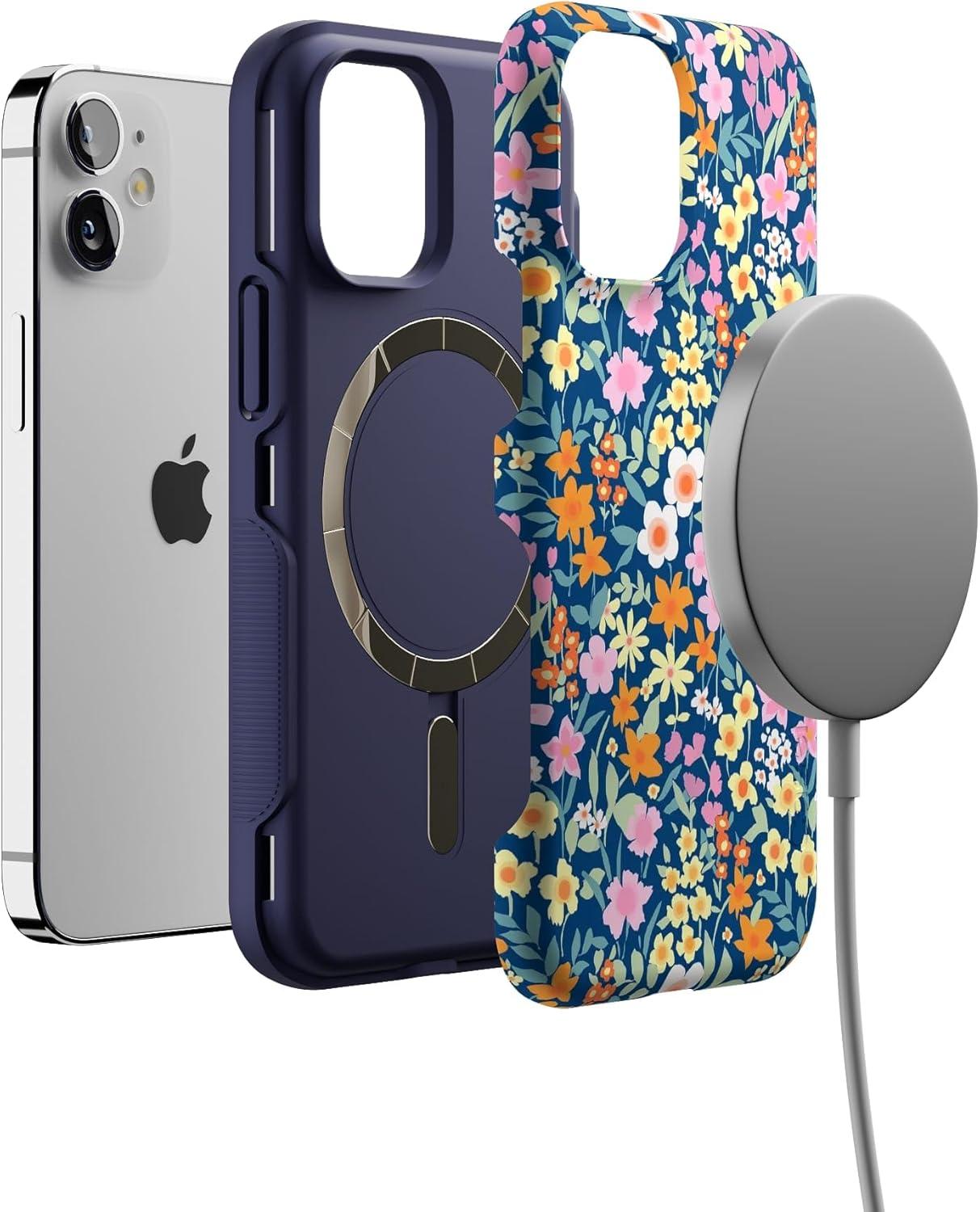Casely iPhone 12 Mini Case | Viva La Vida | Frida Kahlo Collage | Compatible with MagSafe | Bold Protective Design(Full Bloom | Navy Floral)