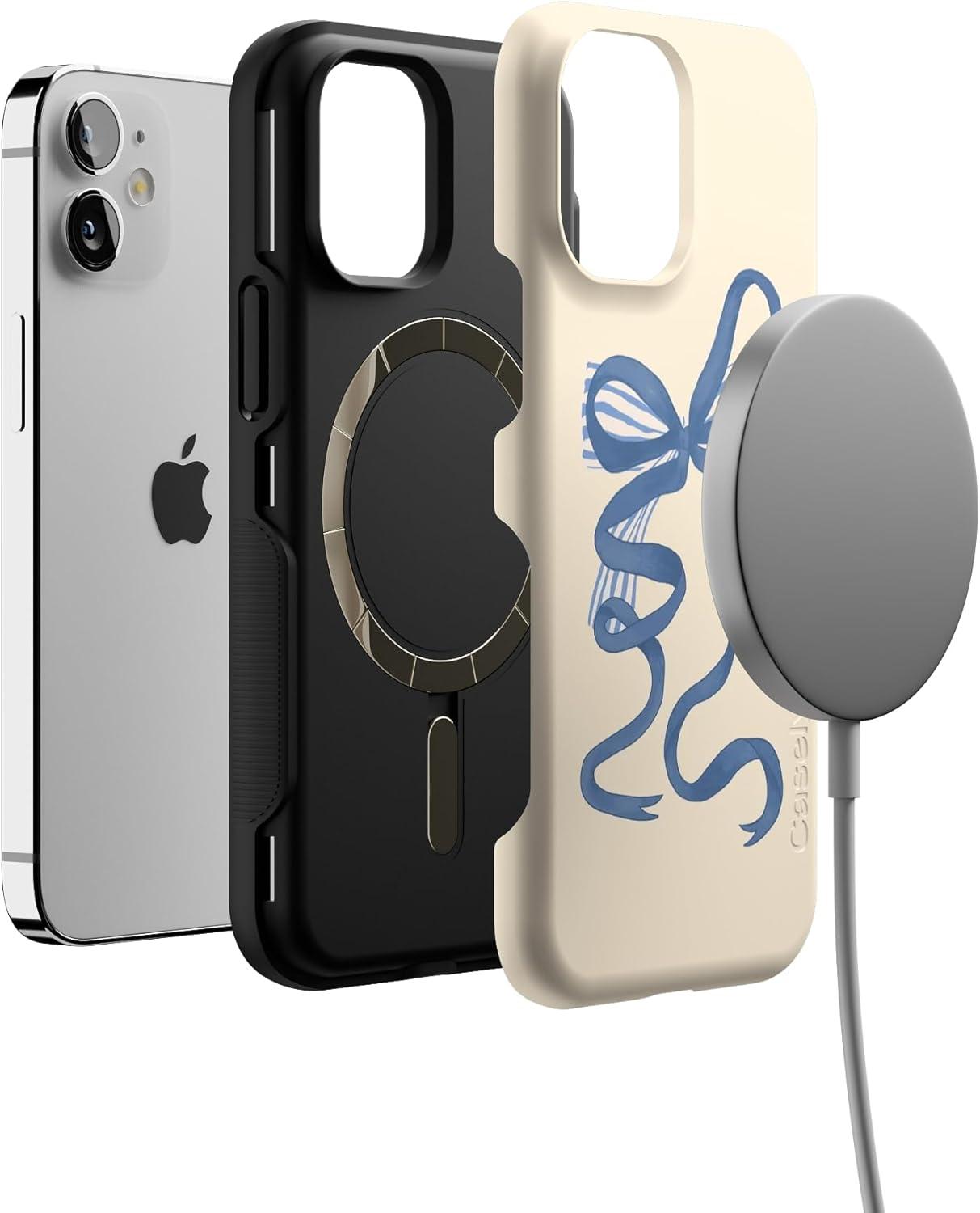 Casely iPhone 12 Mini Case | Viva La Vida | Frida Kahlo Collage | Compatible with MagSafe | Bold Protective Design(Heartstrings | Blue Bow)