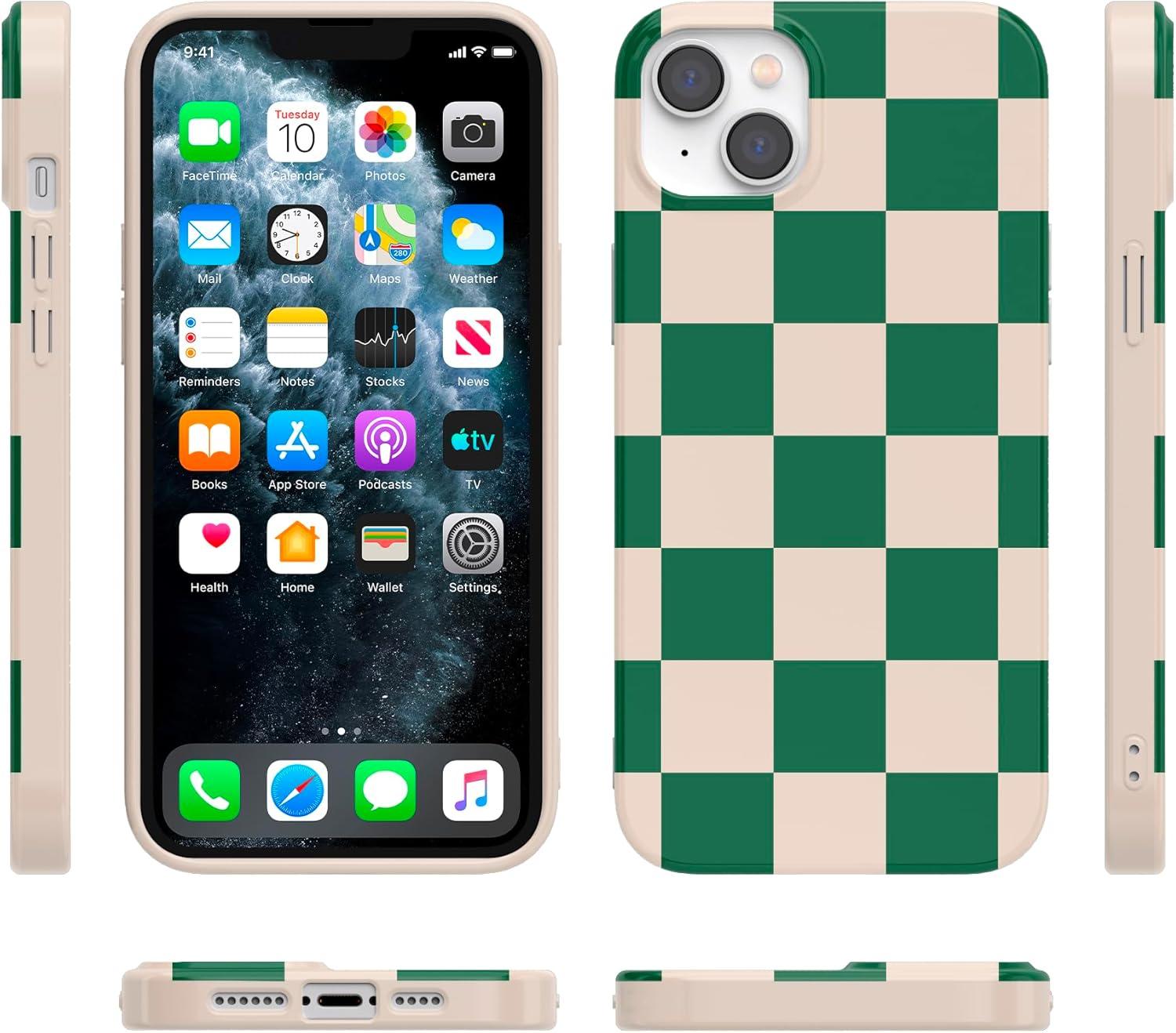 Casely iPhone 13 Case | Moody Monochrome | Twilight Flora | Compatible with MagSafe | Classic Ultra Thin Design(Fit Check | Green Checkerboard)
