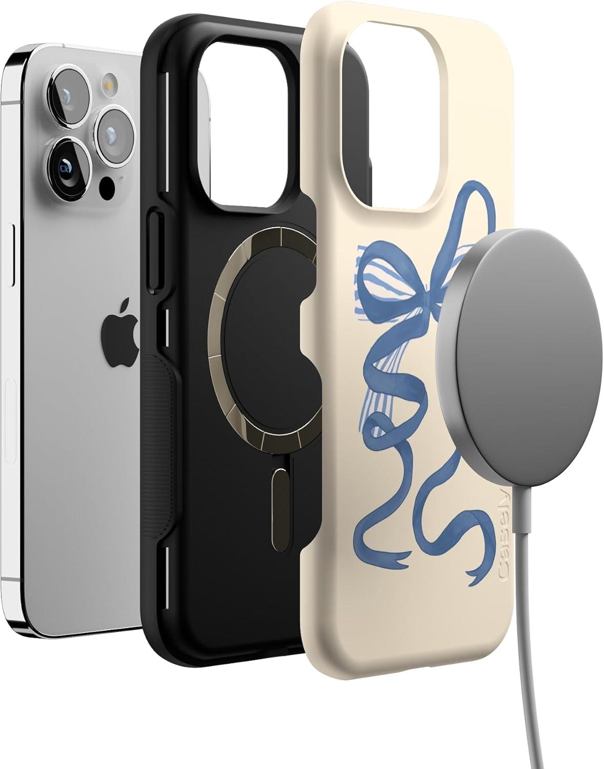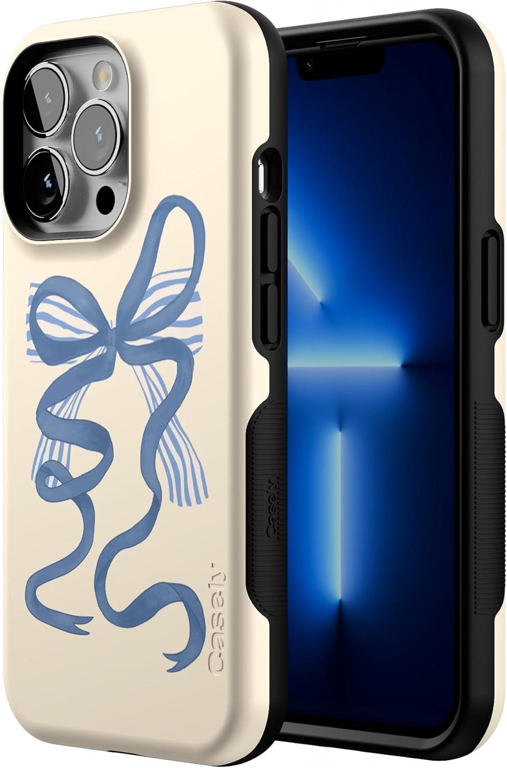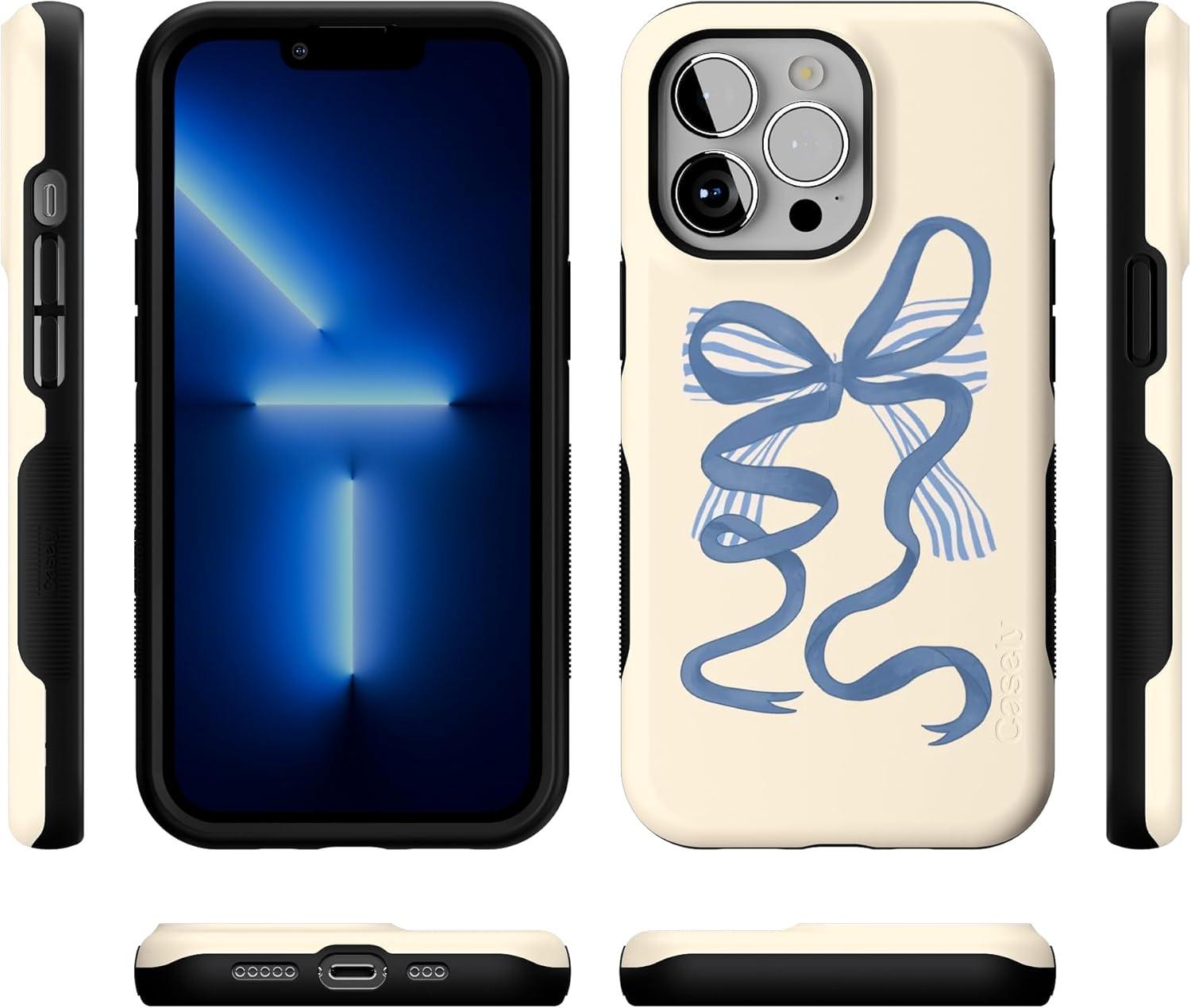 Casely iPhone 13 Pro Case | Ride The Wave | Pastel Rainbow Lined | Compatible with MagSafe | Bold Protective Design(Heartstrings | Blue Bow)