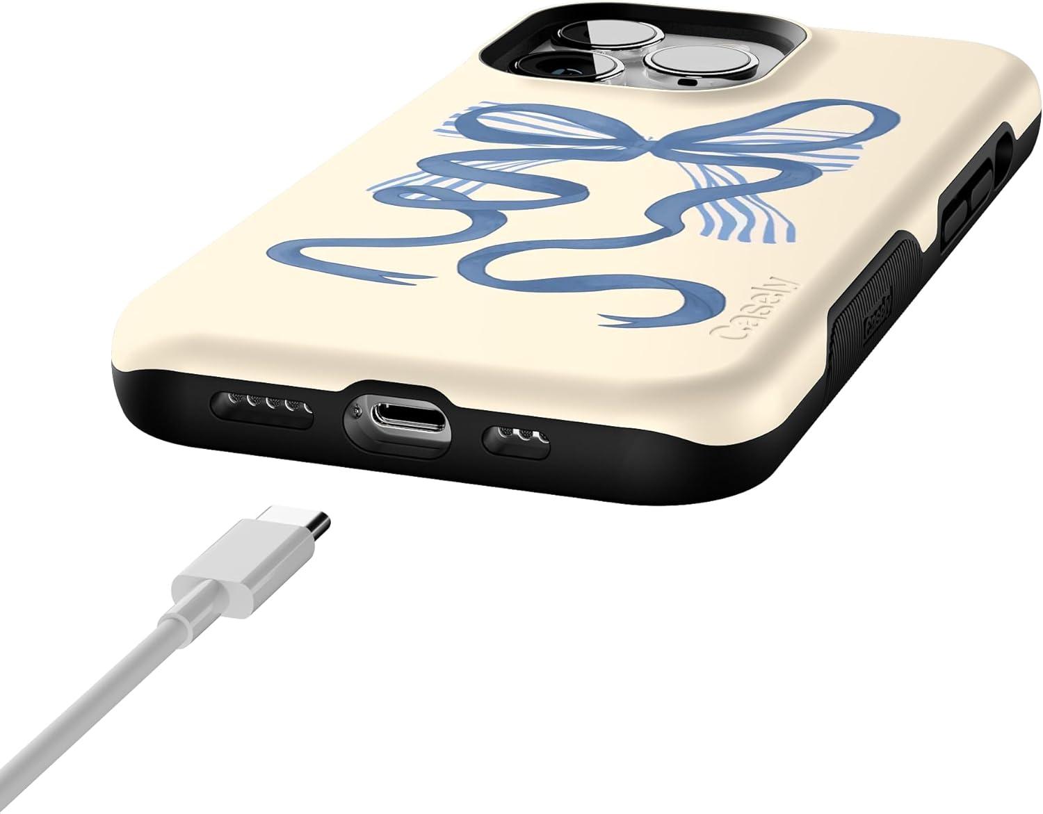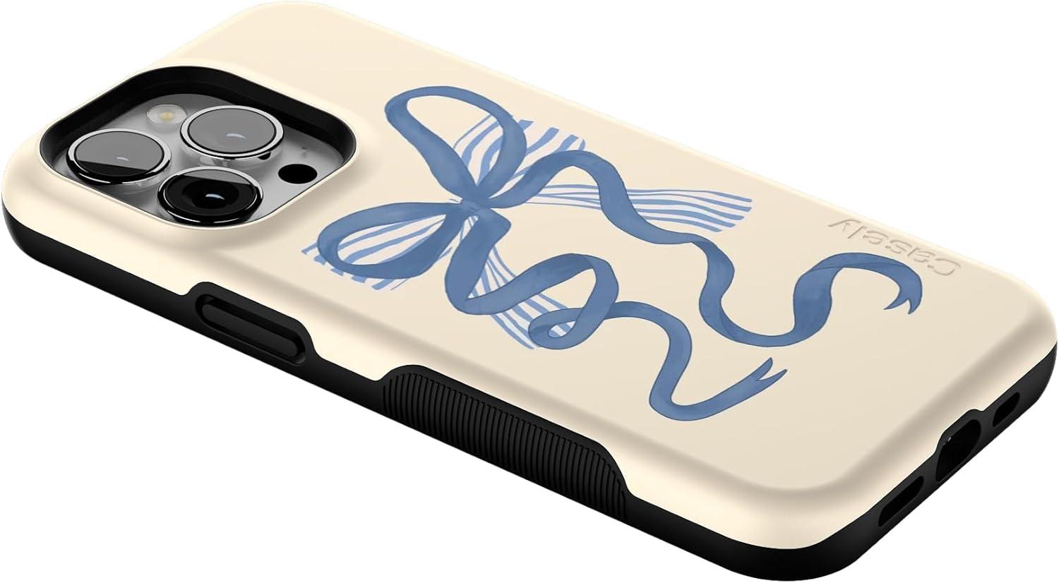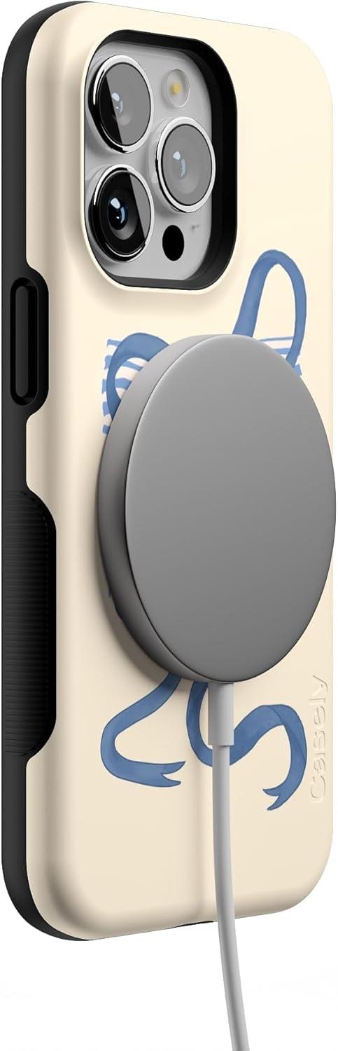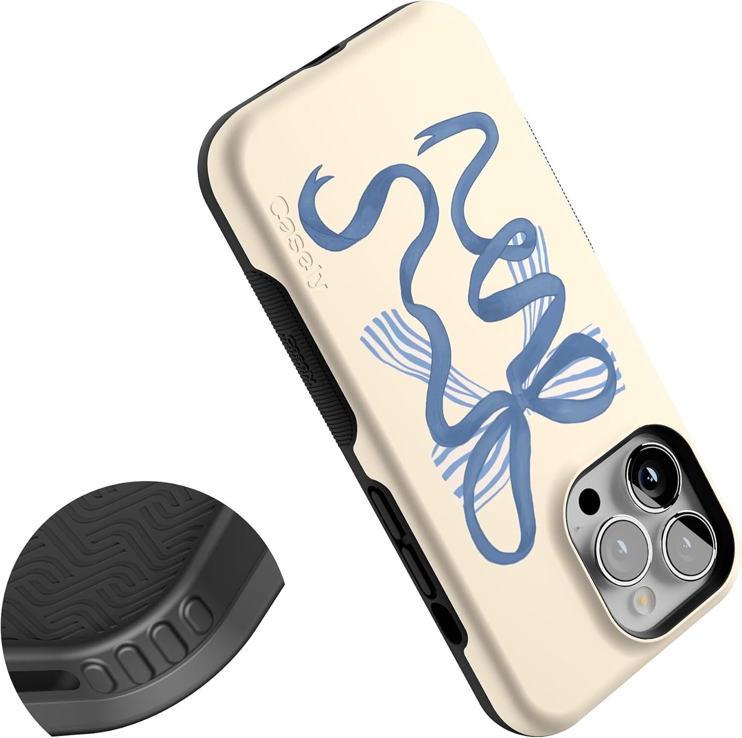 Casely iPhone 13 Pro Case | Ride The Wave | Pastel Rainbow Lined | Compatible with MagSafe | Bold Protective Design(Heartstrings | Blue Bow)