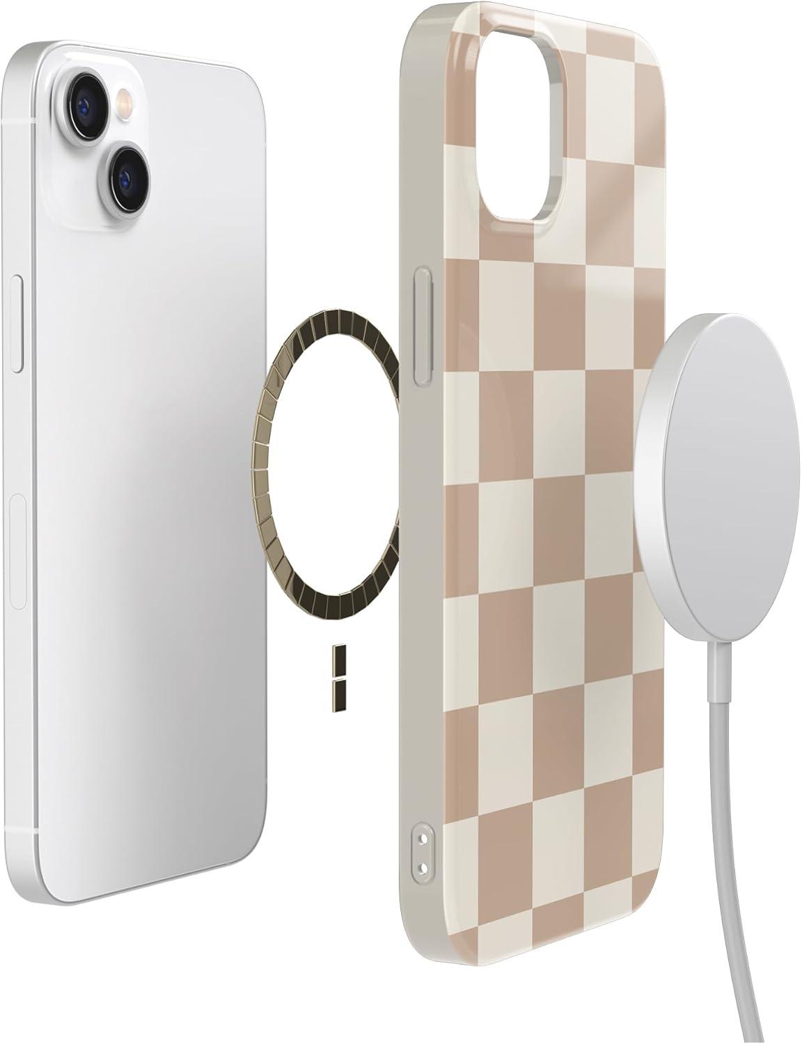 Casely iPhone 14 Case | All Smiles | Smiley Face Sticker | Compatible with MagSafe | Classic Ultra Slim Design(Fit Check | Neutral Checkerboard Checkered)
