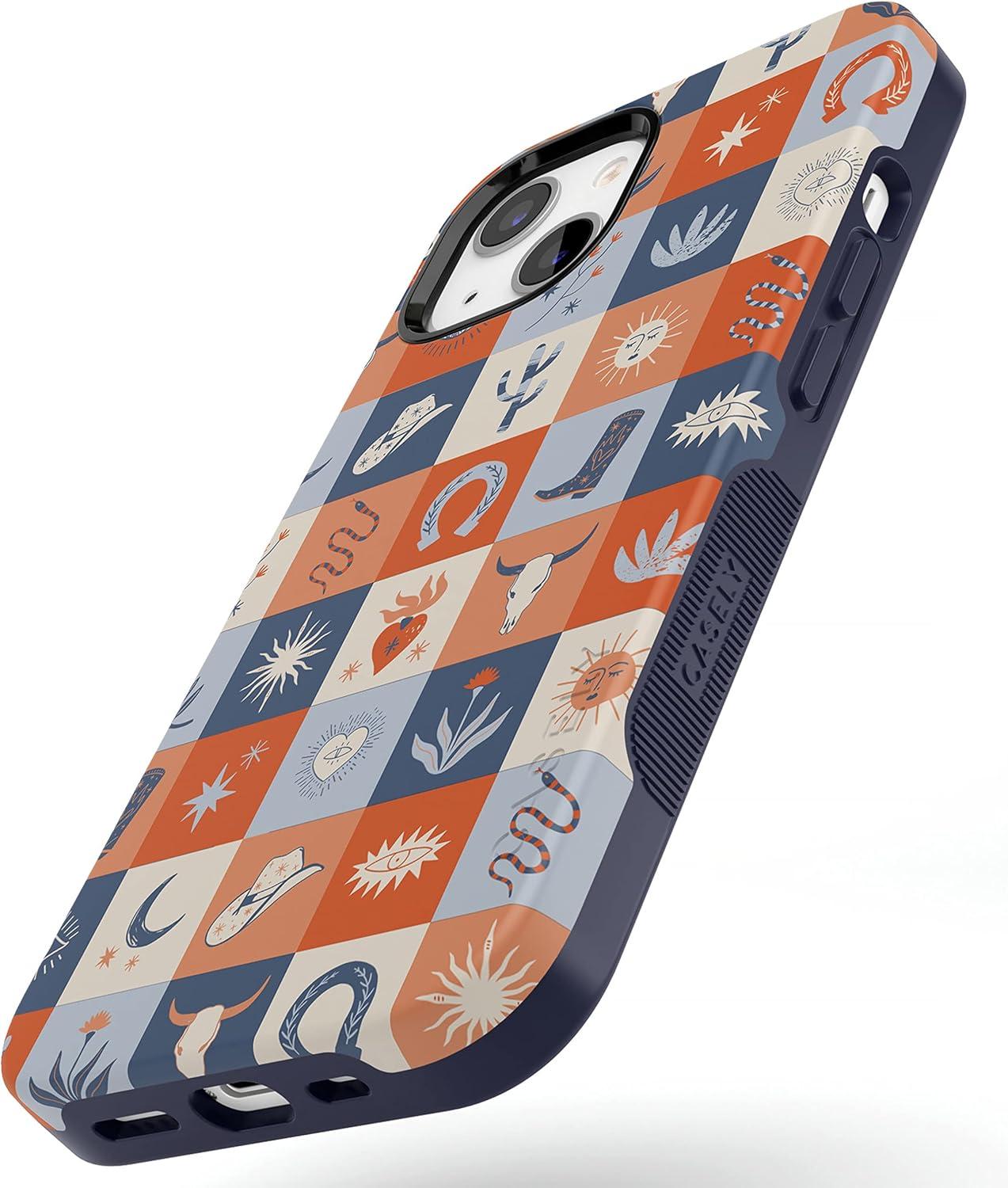 Casely iPhone 14 Case | Blue Awakening | Van Gogh Almond Blossom | Compatible with MagSafe | Bold Protective Design(Dirt Road Chic | Western Squares)