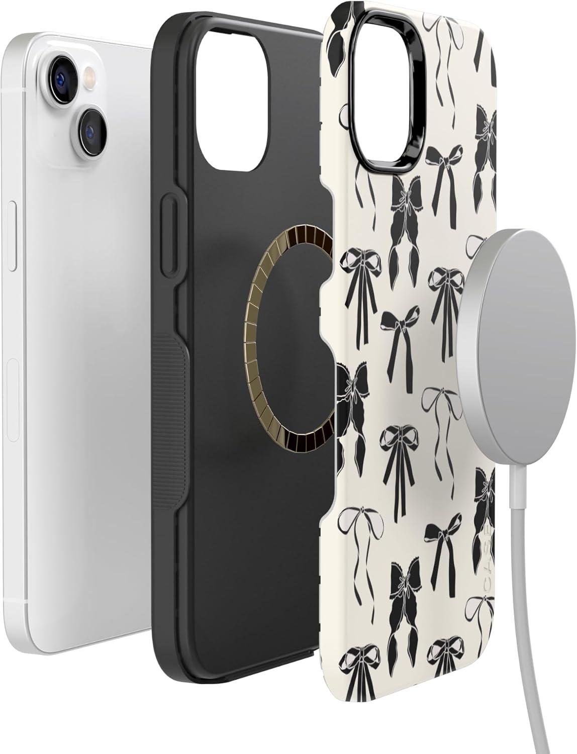 Casely iPhone 14 Case | Blue Awakening | Van Gogh Almond Blossom | Compatible with MagSafe | Bold Protective Design(Goth Girlie | Black Bows)