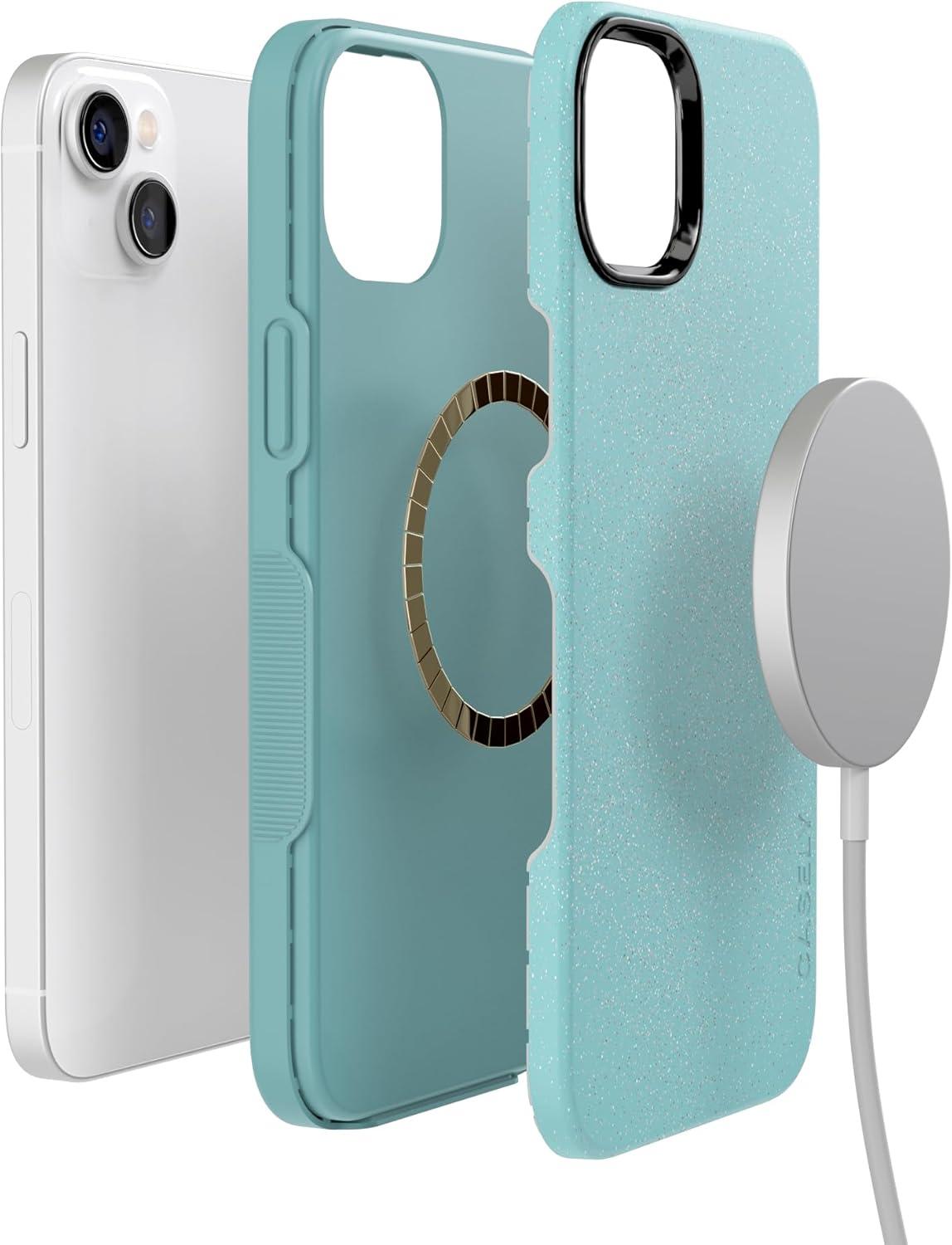Casely iPhone 14 Case | Blue Stripes | Sunday Best | Bold Protective Design | Compatible with MagSafe(Aquamarine | Ocean Blue Shimmer Glitter)