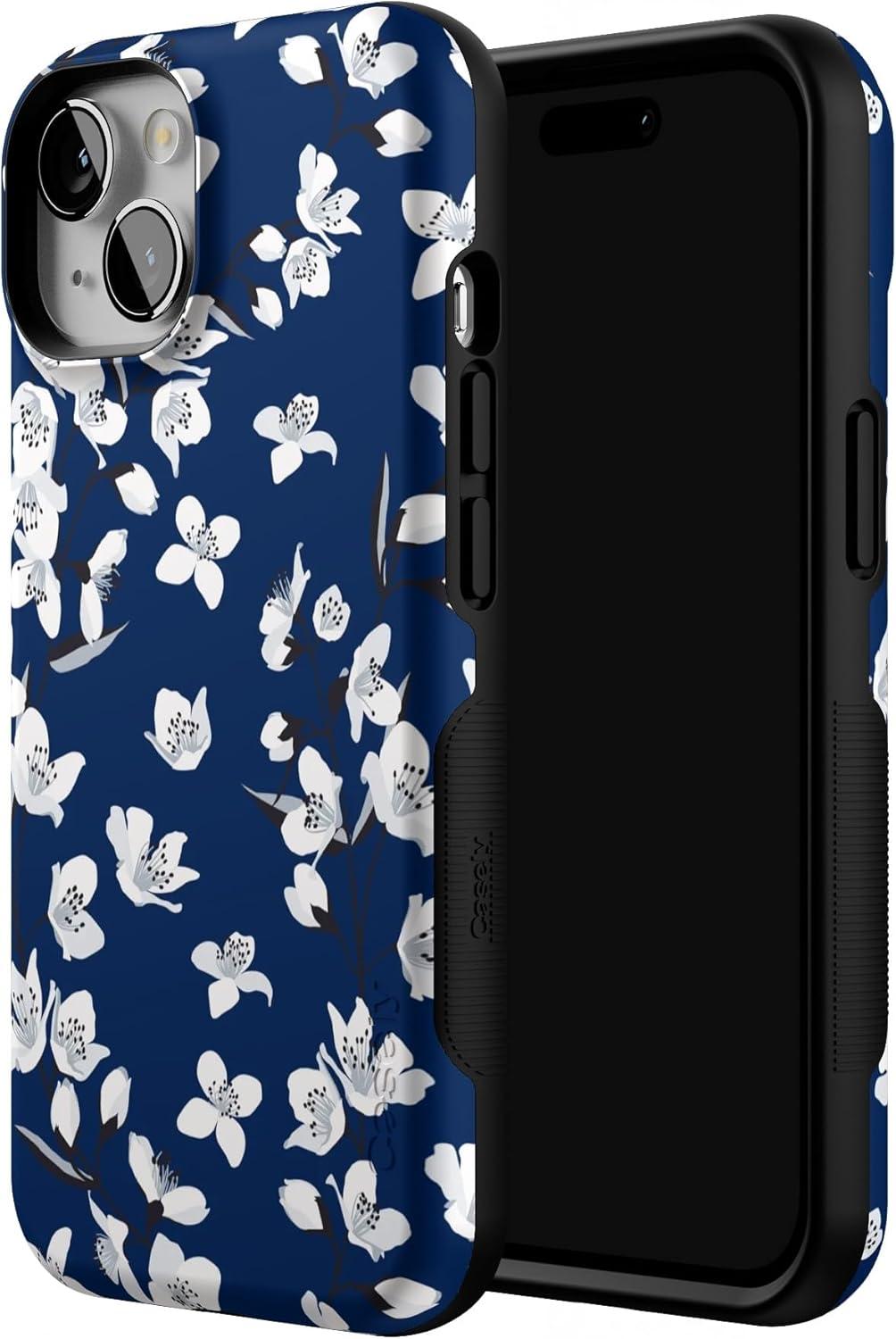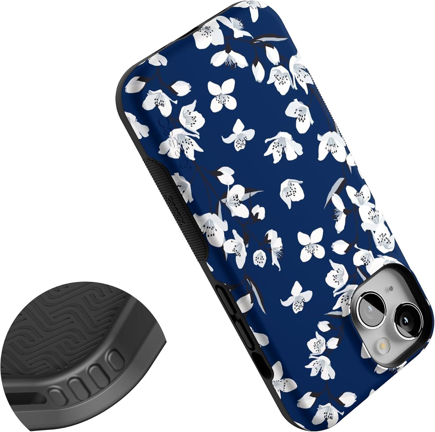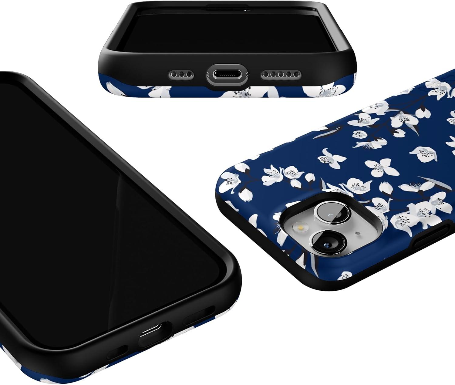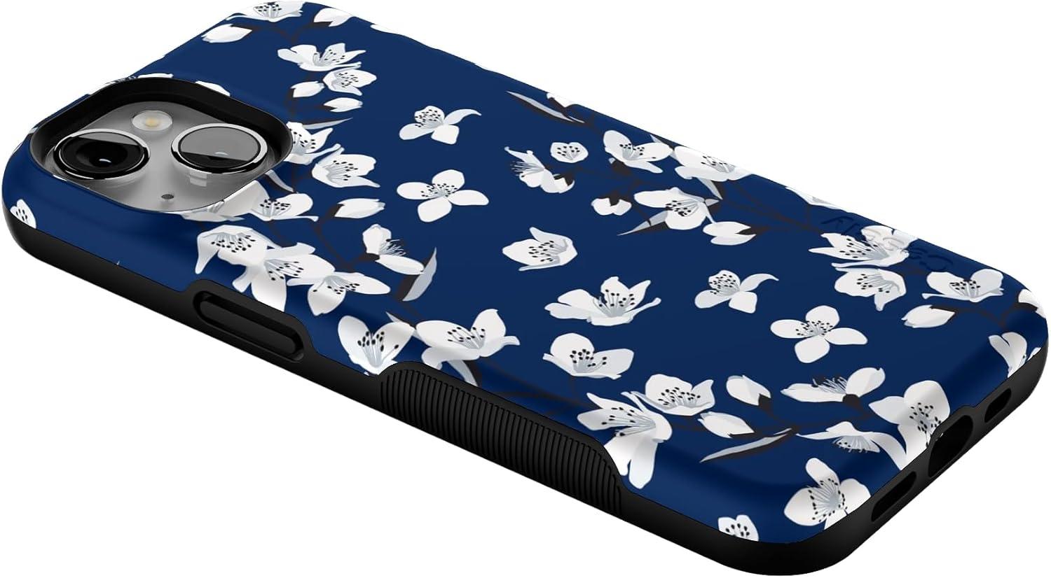 Casely iPhone 14 Case | Lovebug | Blue Hearts | Bold Protective Design | Compatible with MagSafe(Floral Forest | Navy Cherry Blossom)