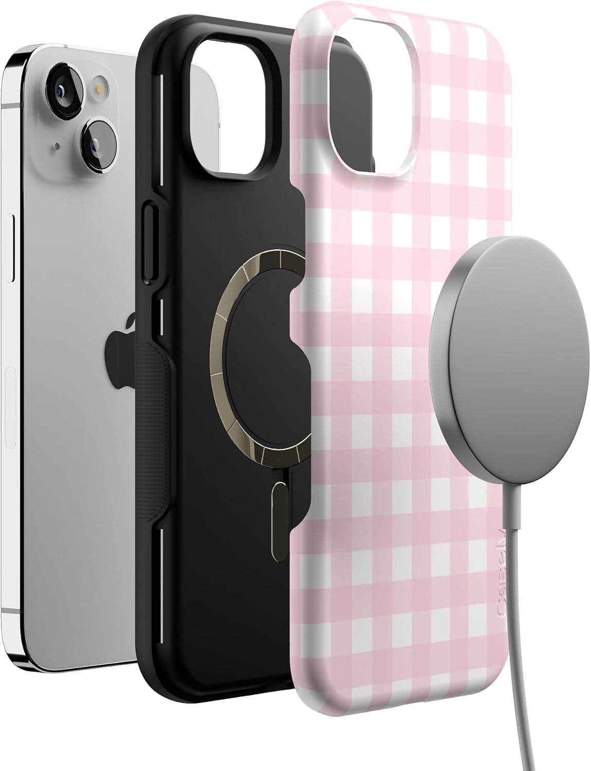 Casely iPhone 14 Case | Lovebug | Blue Hearts | Bold Protective Design | Compatible with MagSafe(Pink Plaid | Sunday Best)