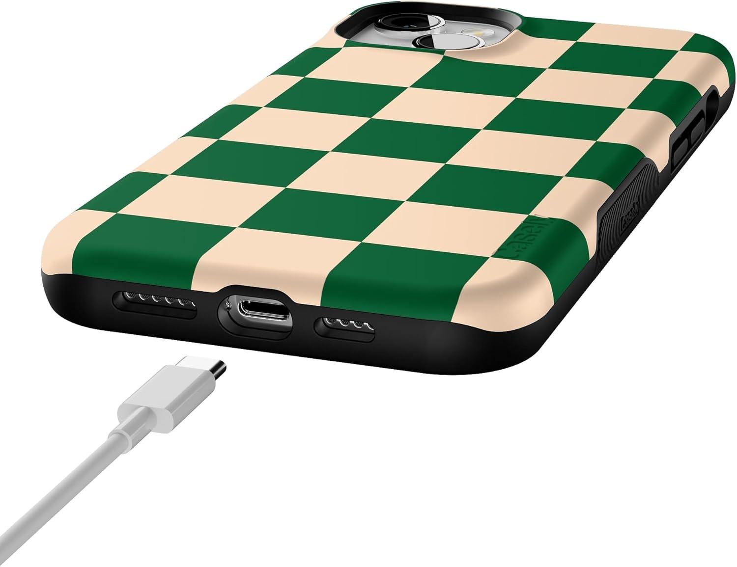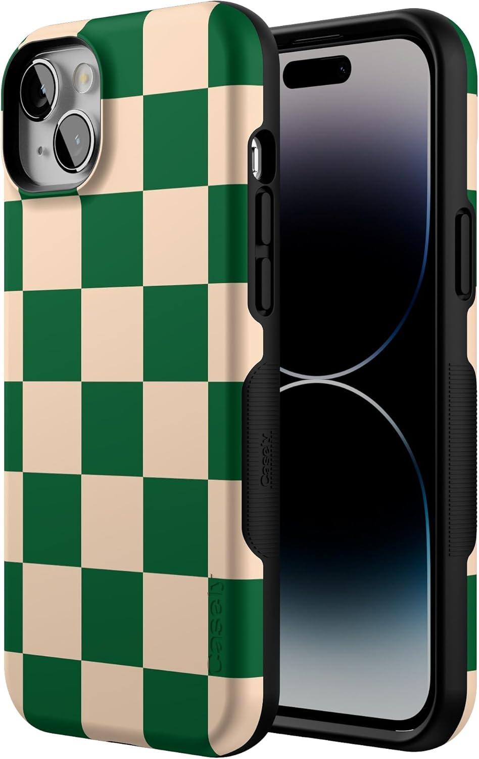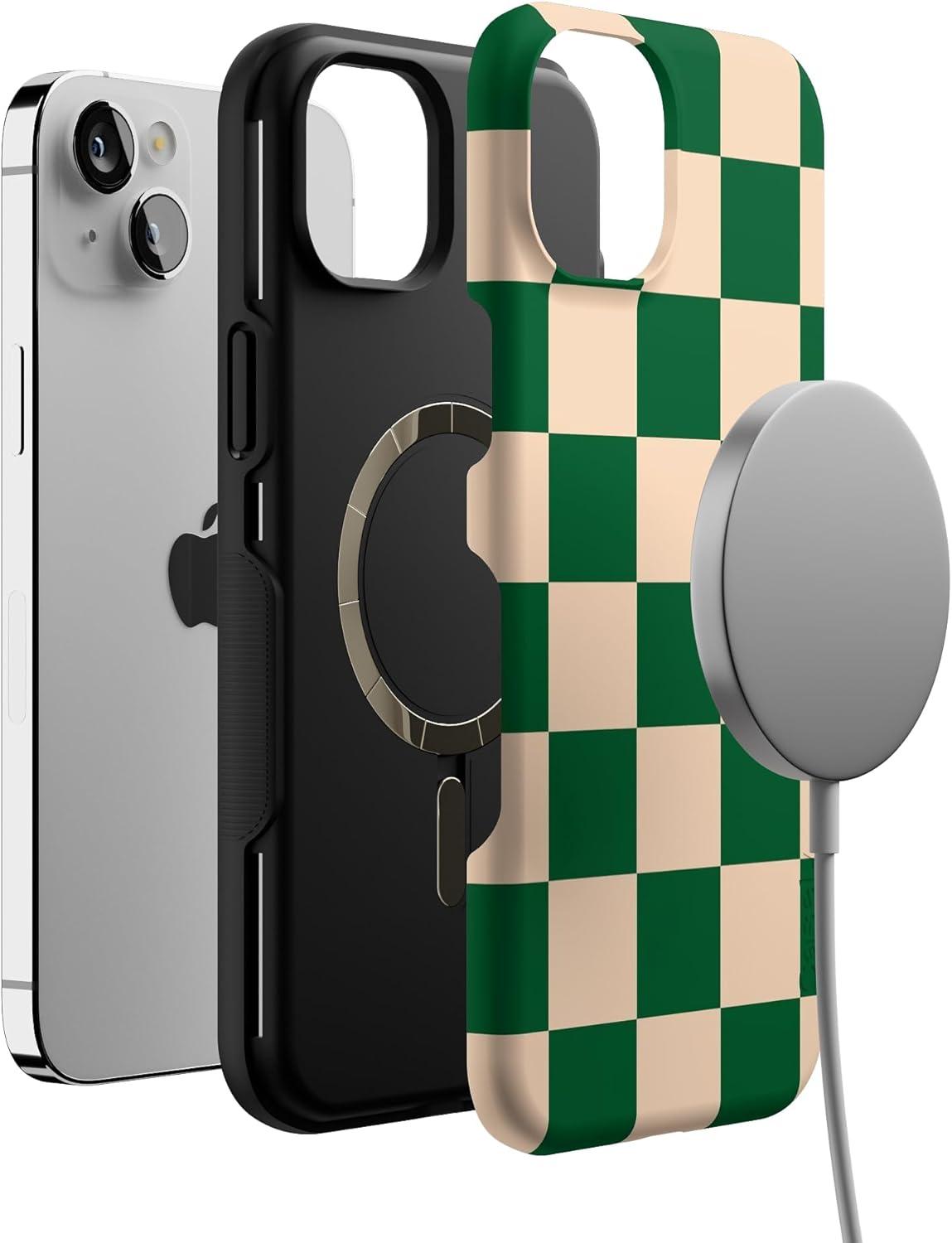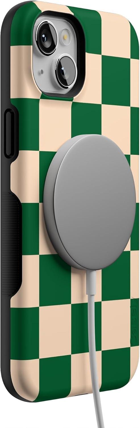Casely iPhone 14 Plus Case | Opposites Attract | Day & Night Mountains | Bold Protective Design | Compatible with MagSafe(Fit Check | Green Checkerboard)