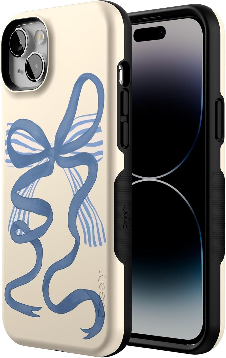 Casely iPhone 14 Plus Case | Opposites Attract | Day & Night Mountains | Bold Protective Design | Compatible with MagSafe(Heartstrings | Blue Bow)
