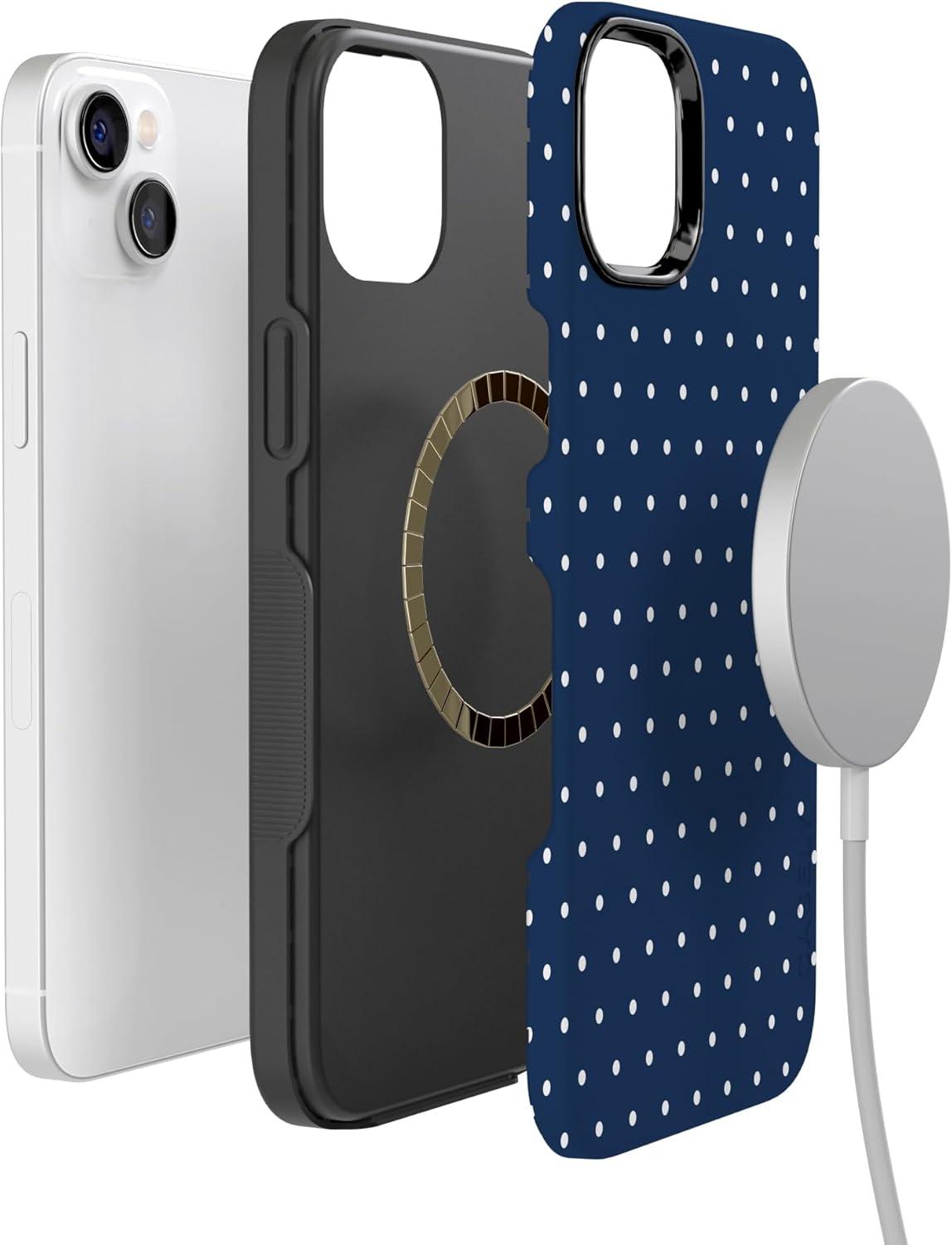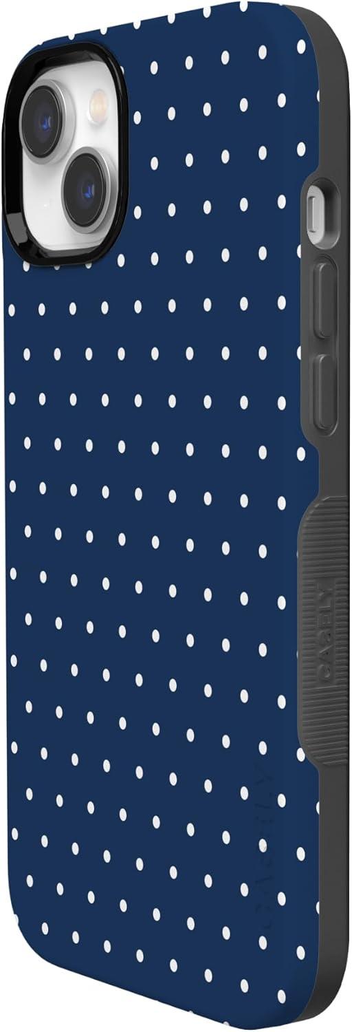 Casely iPhone 14 Plus Case | Opposites Attract | Day & Night Mountains | Bold Protective Design | Compatible with MagSafe(On the Dot | Navy Polka Dot)