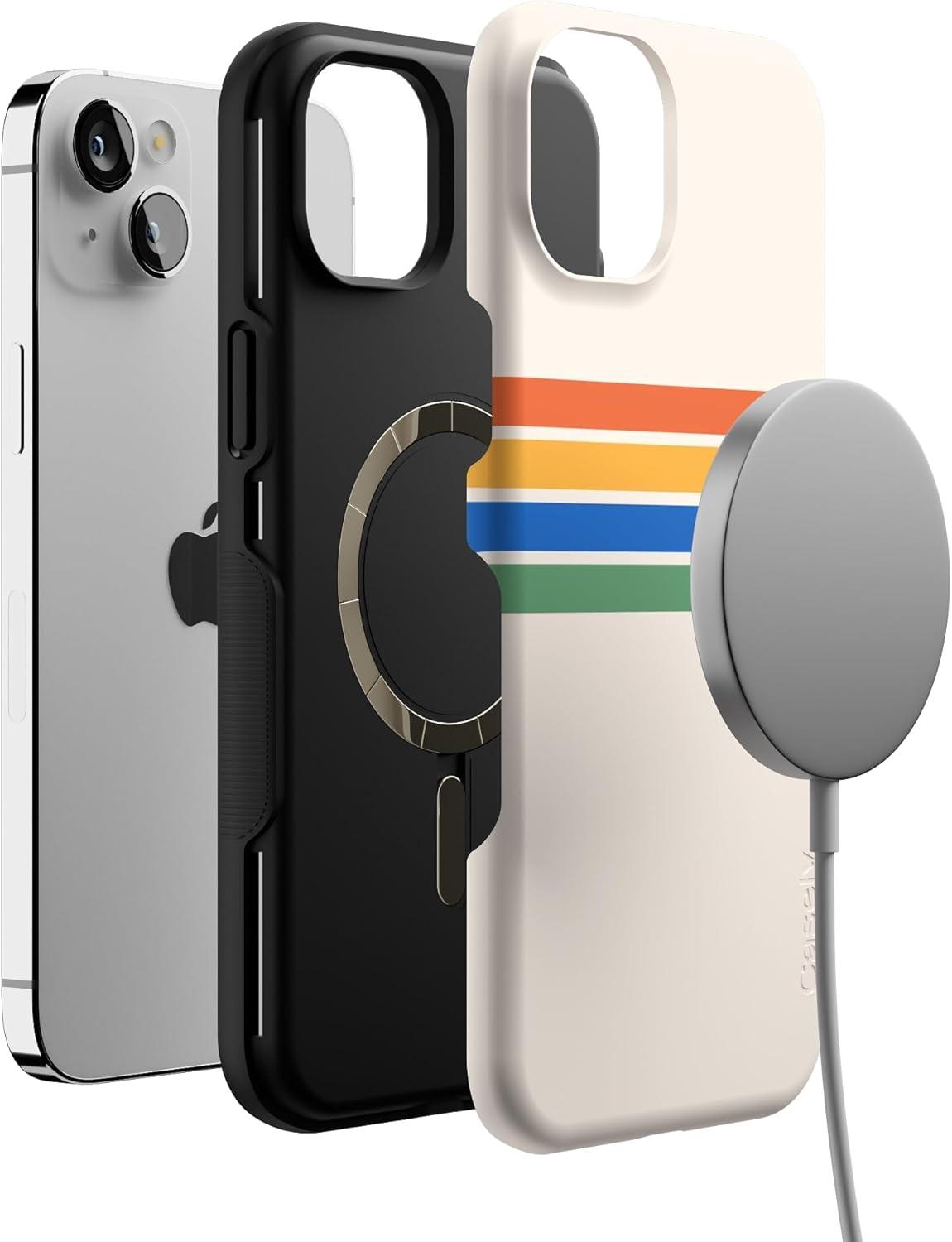 Casely iPhone 14 Plus Case | Opposites Attract | Day & Night Mountains | Bold Protective Design | Compatible with MagSafe(Totally Groovy | Rainbow Stripes Color Block)