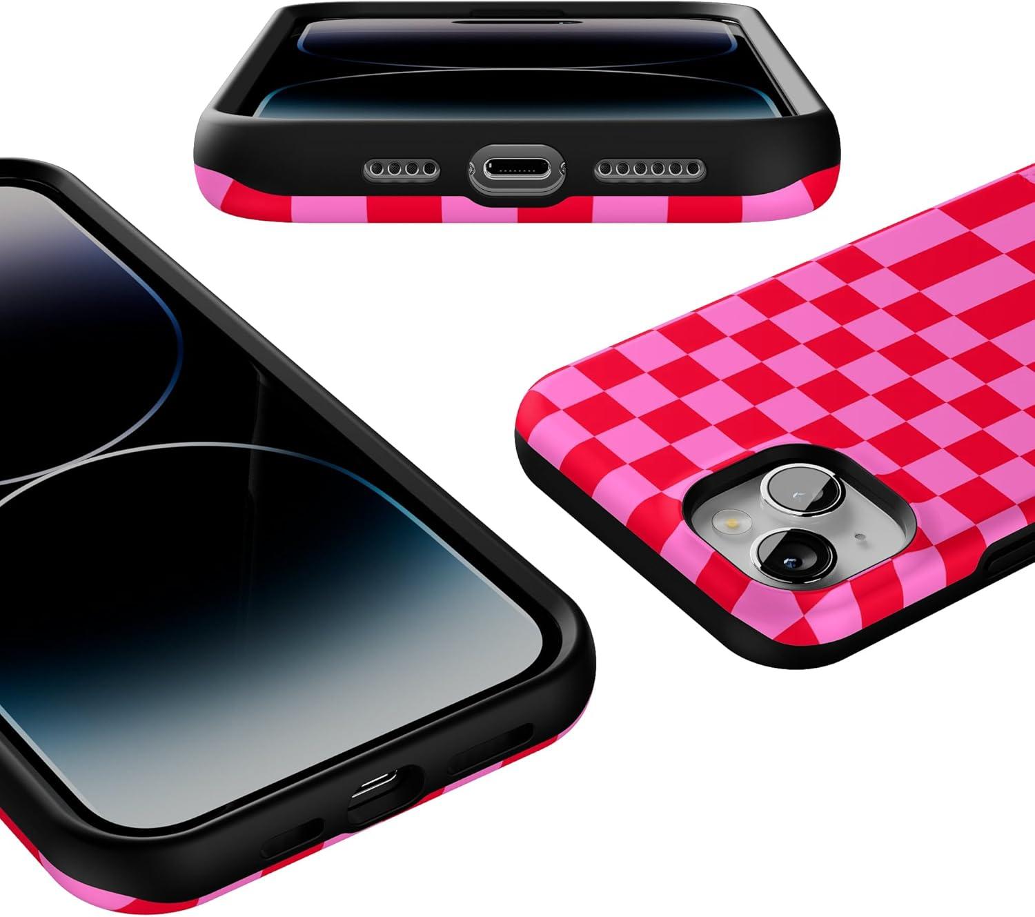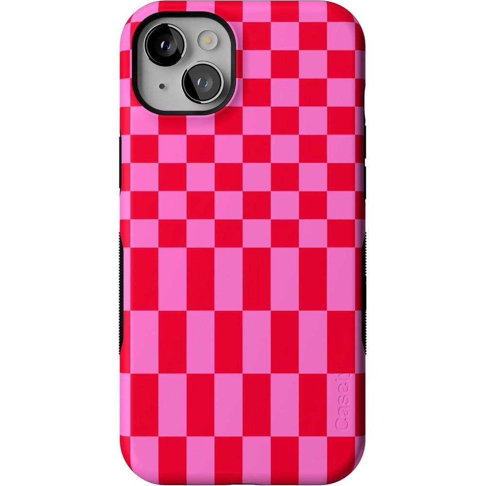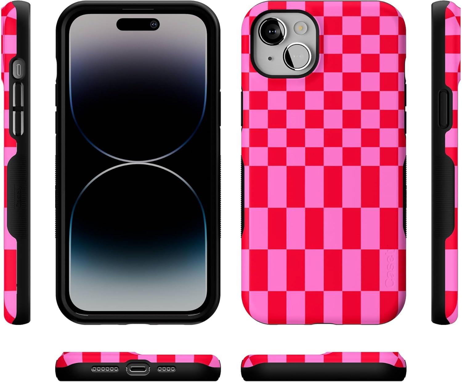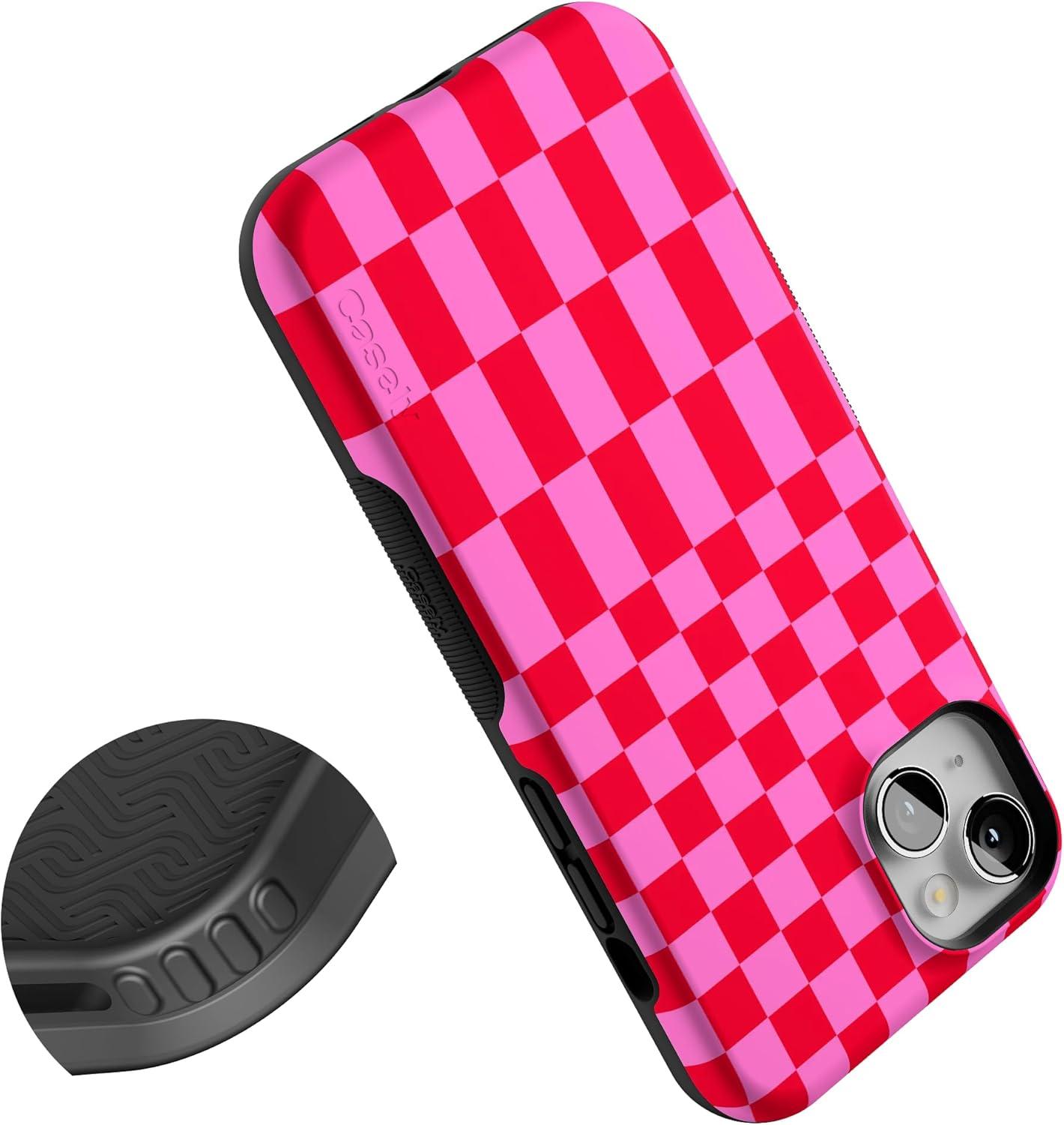 Casely iPhone 14 Plus Case | Opposites Attract | Day & Night Mountains | Bold Protective Design | Compatible with MagSafe(Vibe Check | Pink Checkerboard)