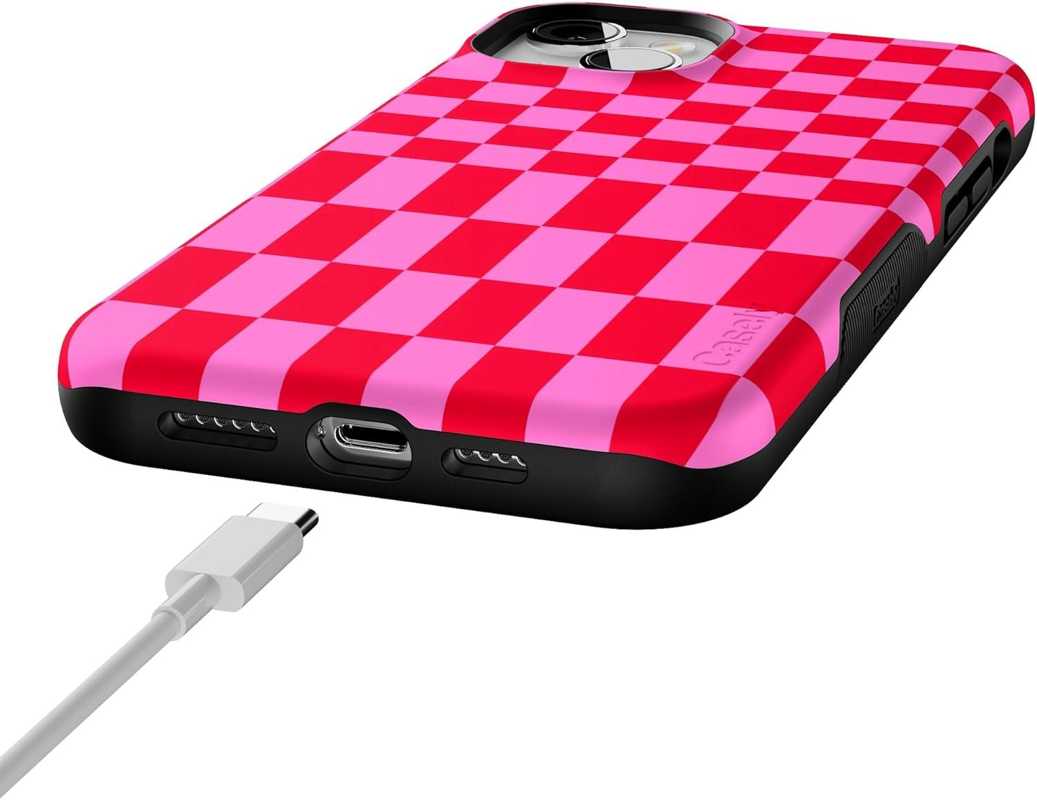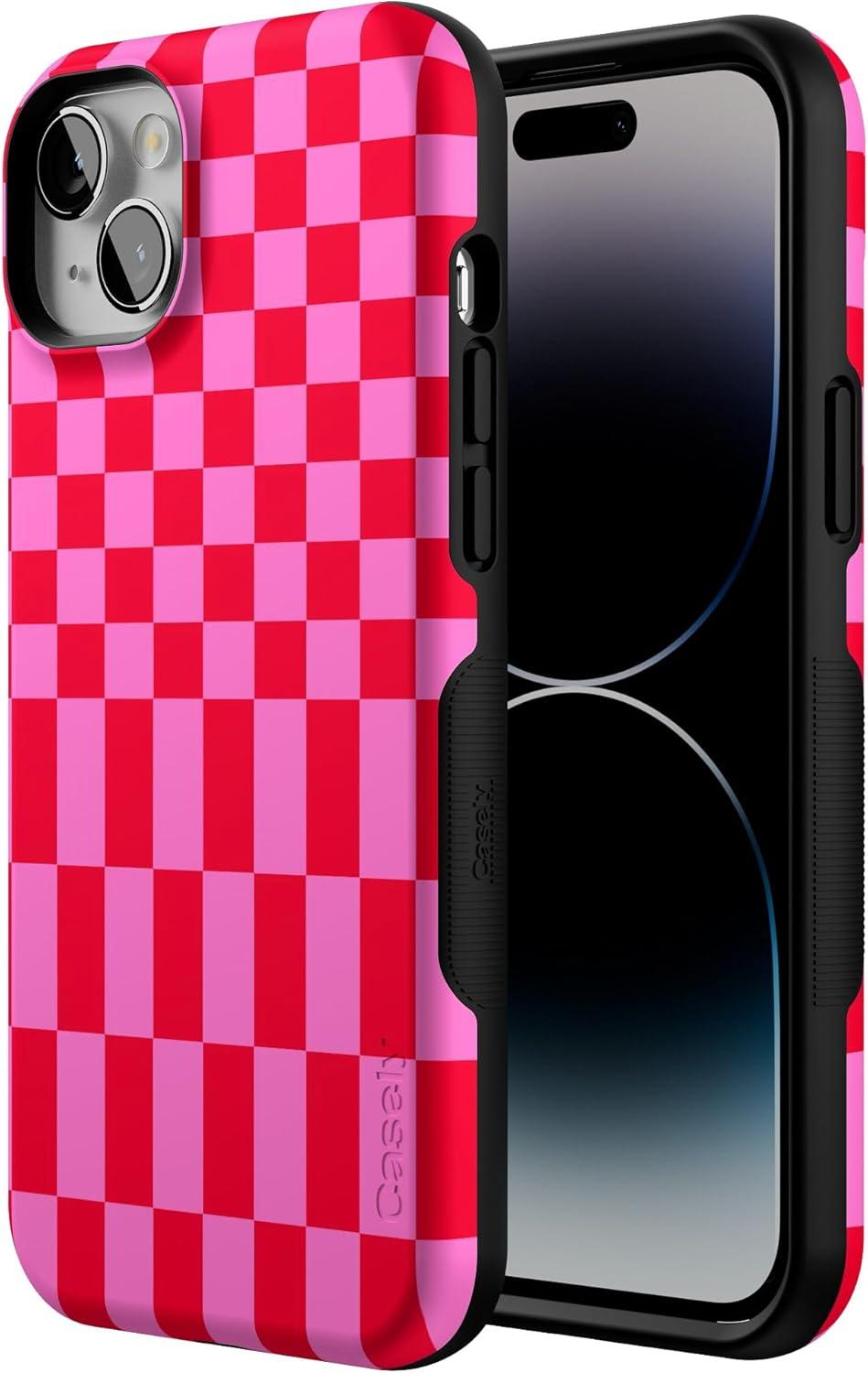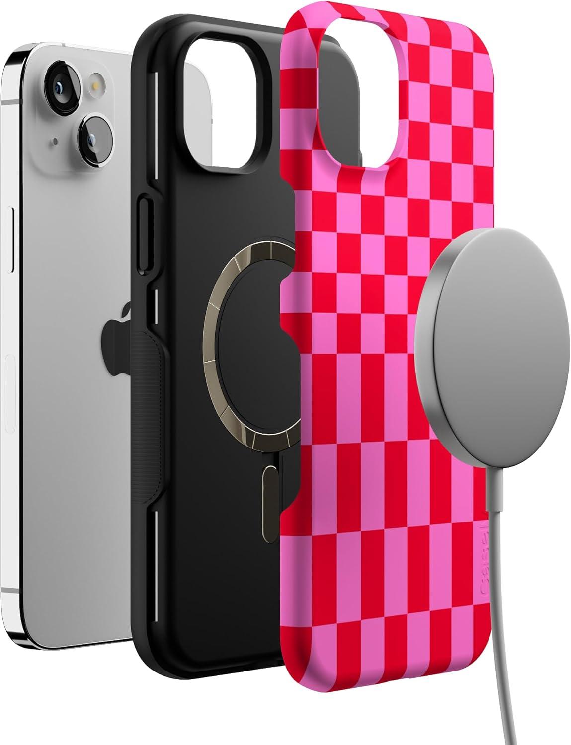 Casely iPhone 14 Plus Case | Opposites Attract | Day & Night Mountains | Bold Protective Design | Compatible with MagSafe(Vibe Check | Pink Checkerboard)