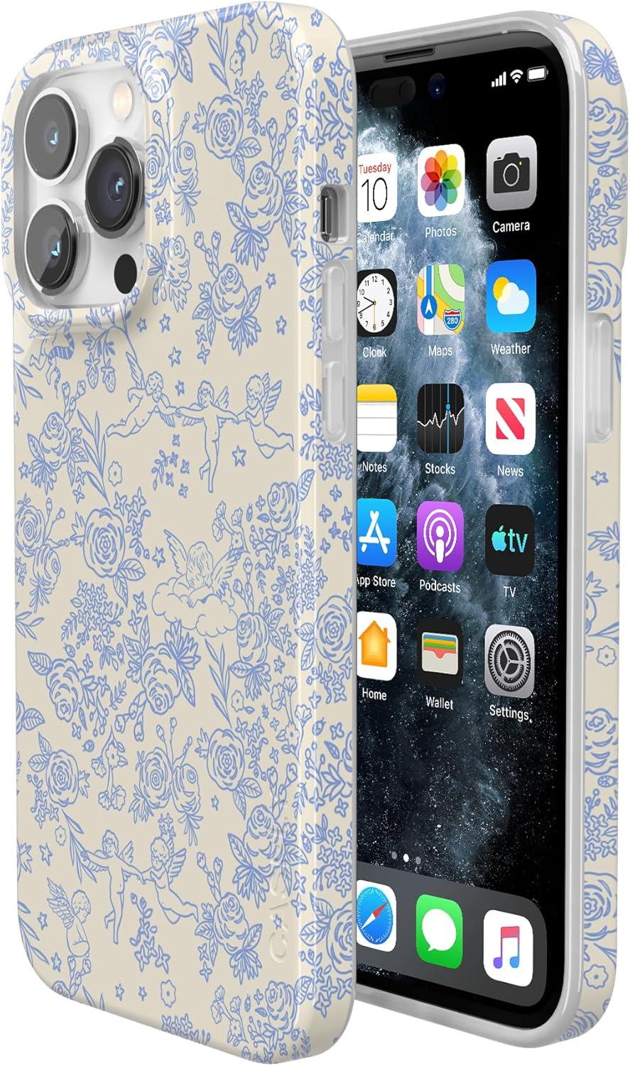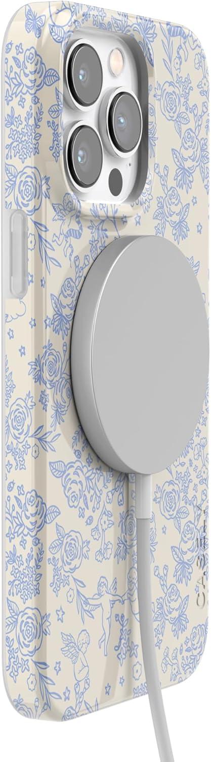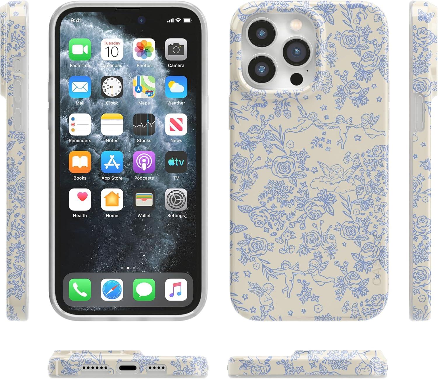 Casely iPhone 14 Pro Case | Black Pearl Marble | Compatible with MagSafe | Classic Ultra Thin Design(Cupid’s Canvas | Periwinkle Floral)