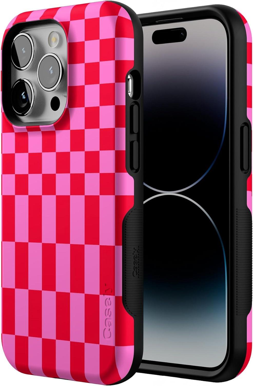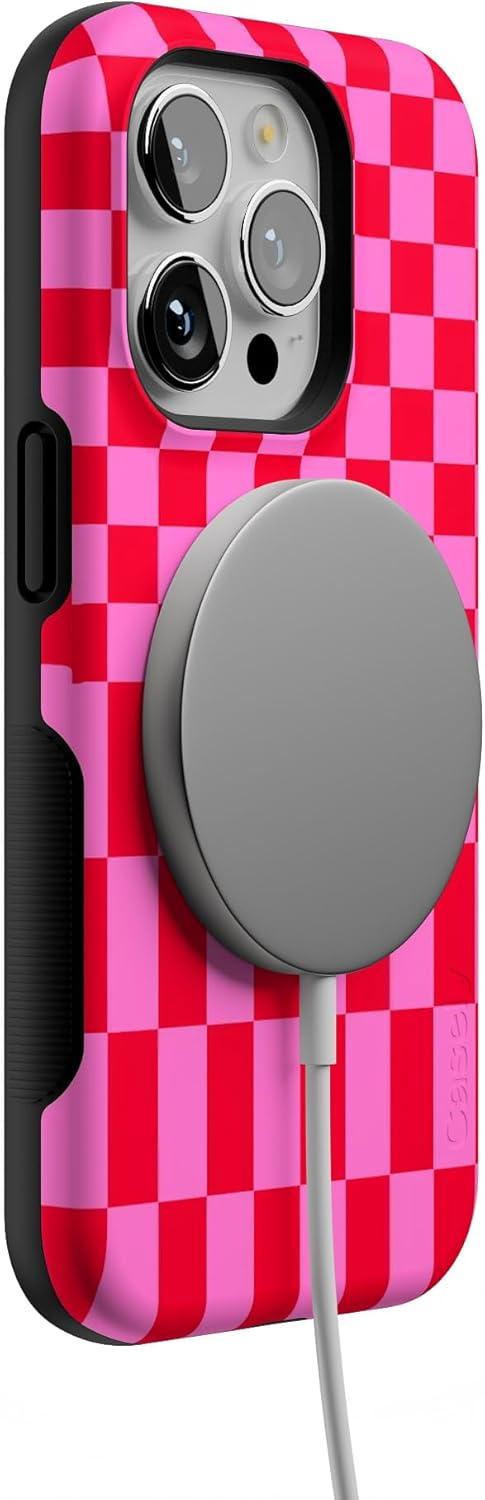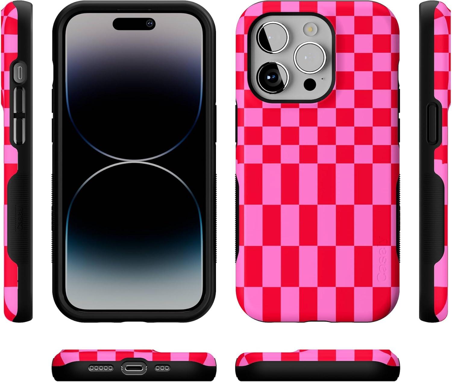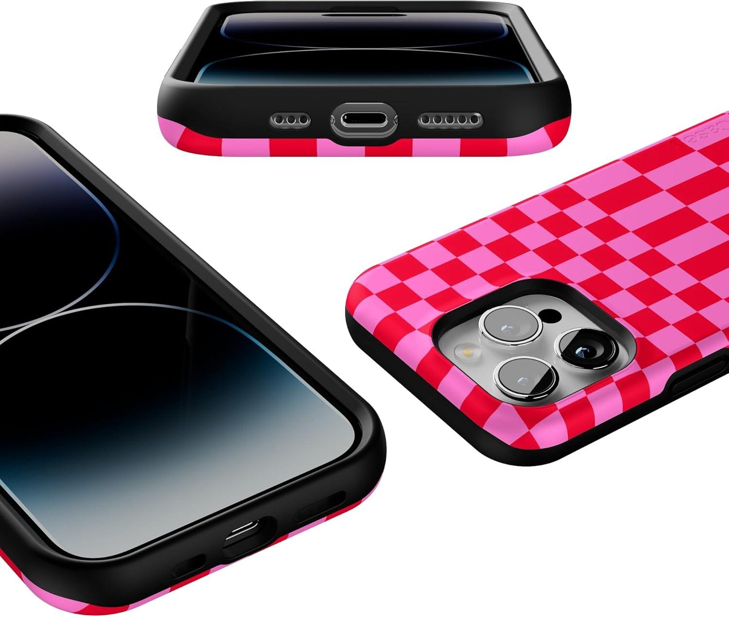 Casely iPhone 14 Pro Case | Opposites Attract | Day & Night Mountains | Compatible with MagSafe | Bold Protective Design(Vibe Check | Pink Checkerboard)