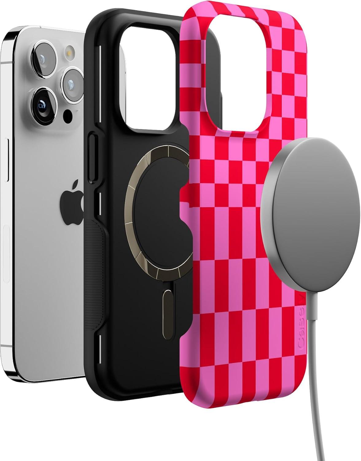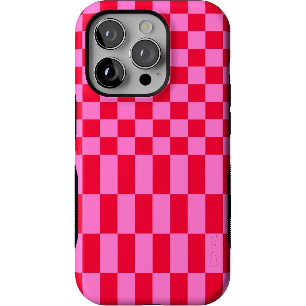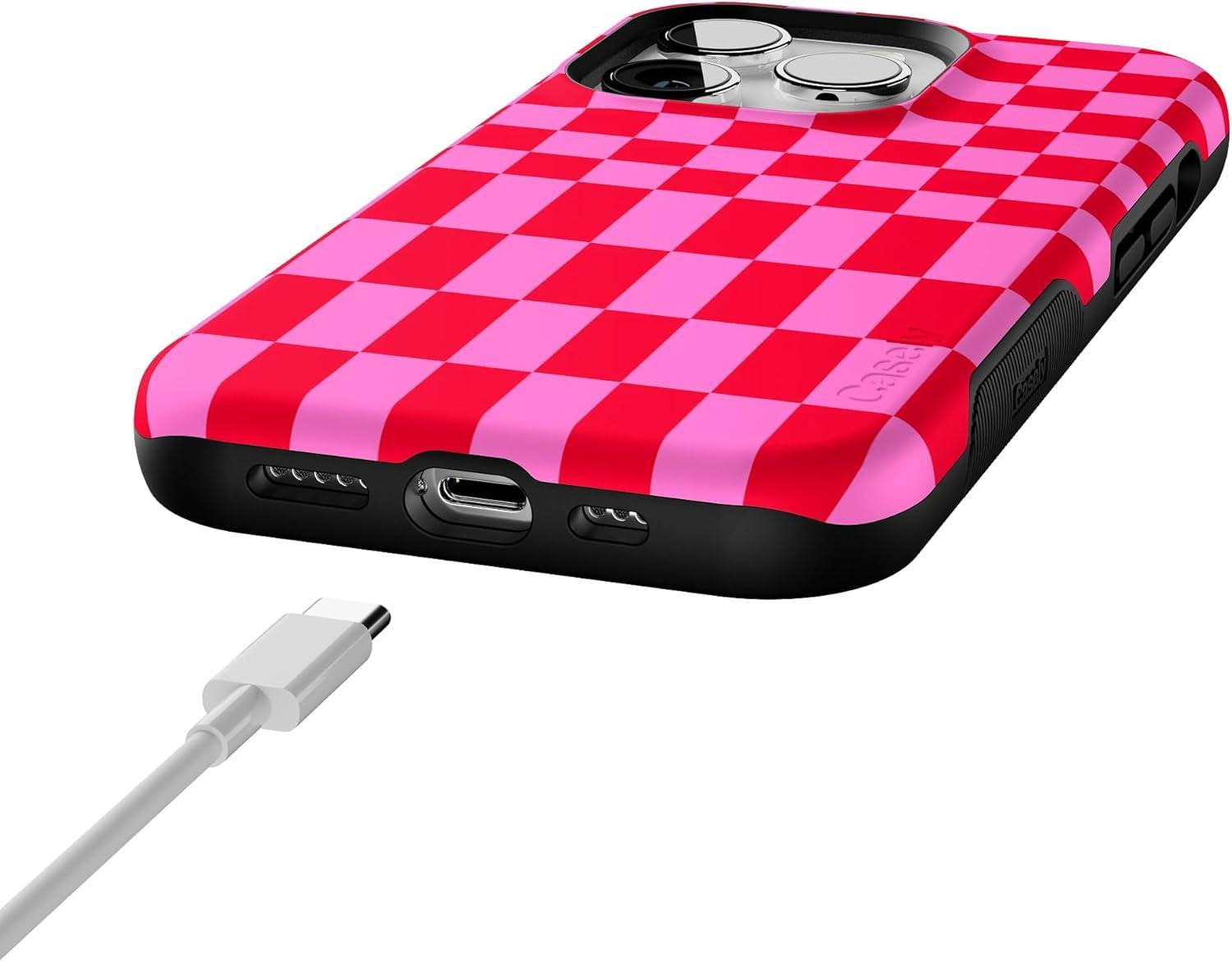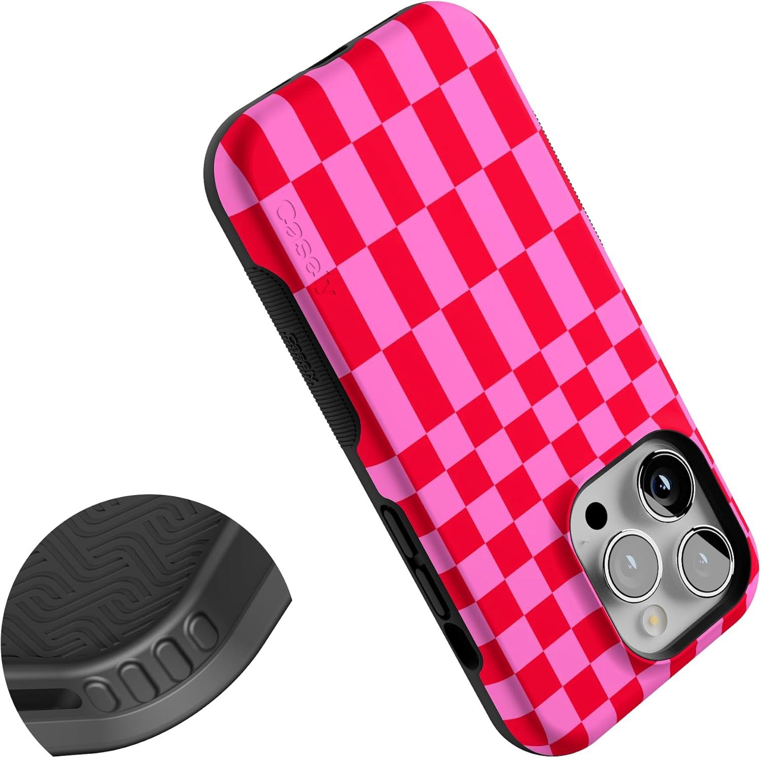 Casely iPhone 14 Pro Case | Opposites Attract | Day & Night Mountains | Compatible with MagSafe | Bold Protective Design(Vibe Check | Pink Checkerboard)