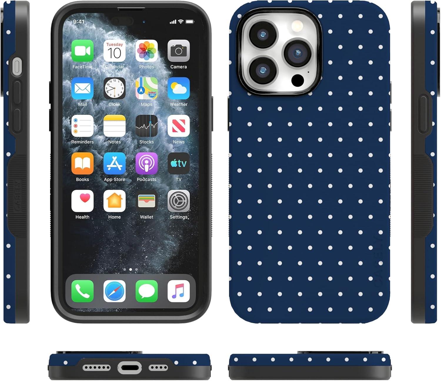 Casely iPhone 14 Pro Max Case | Blue Stripes | Sunday Best | Bold Protective Design | Compatible with MagSafe(On the Dot | Navy Polka Dot)