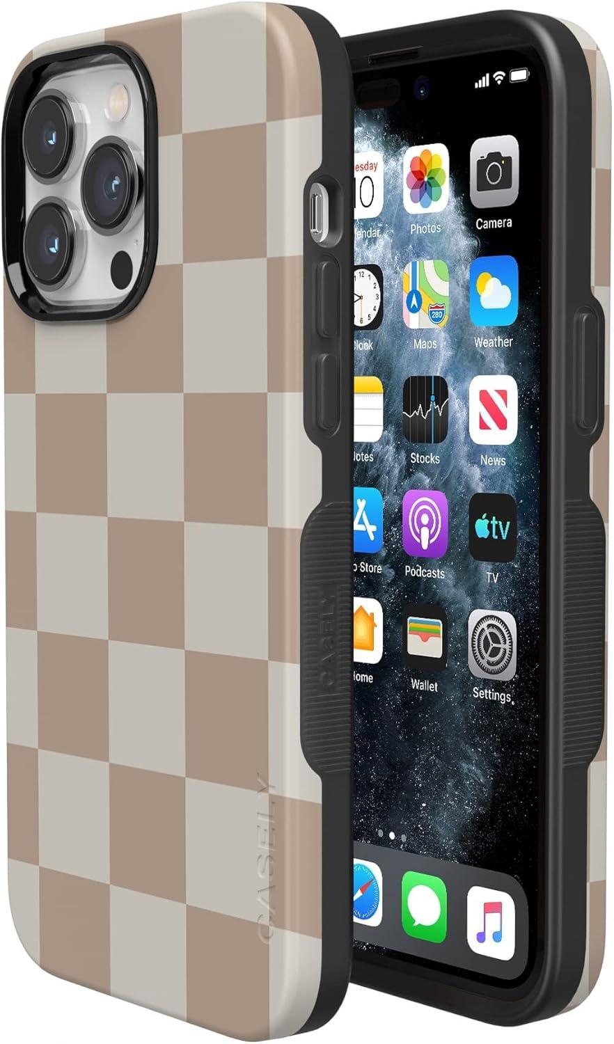 Casely iPhone 14 Pro Max Case | Nantucket Cottage | Blue Hydrangea | Compatible with MagSafe | Bold Protective Design(Fit Check | Neutral Checkerboard)