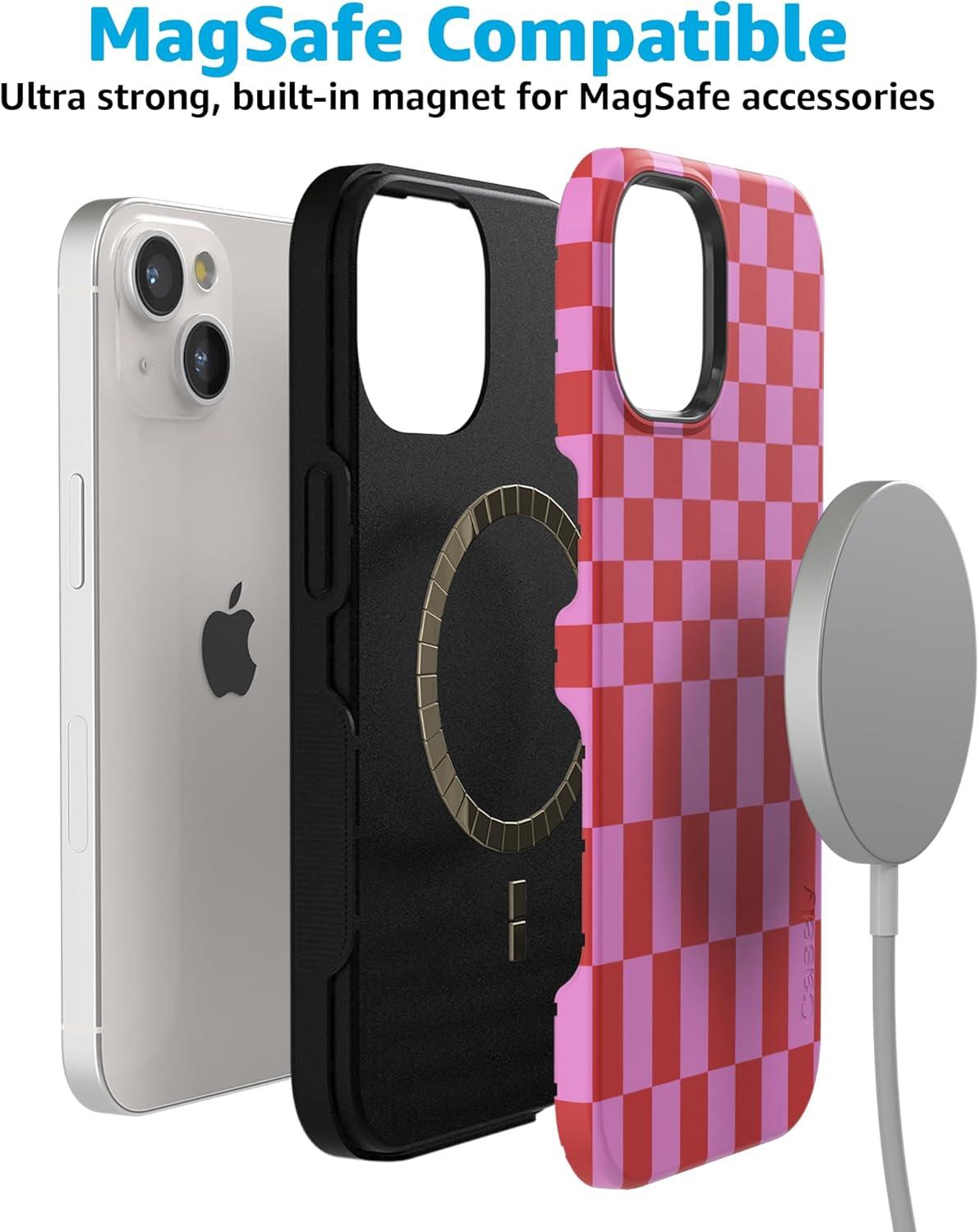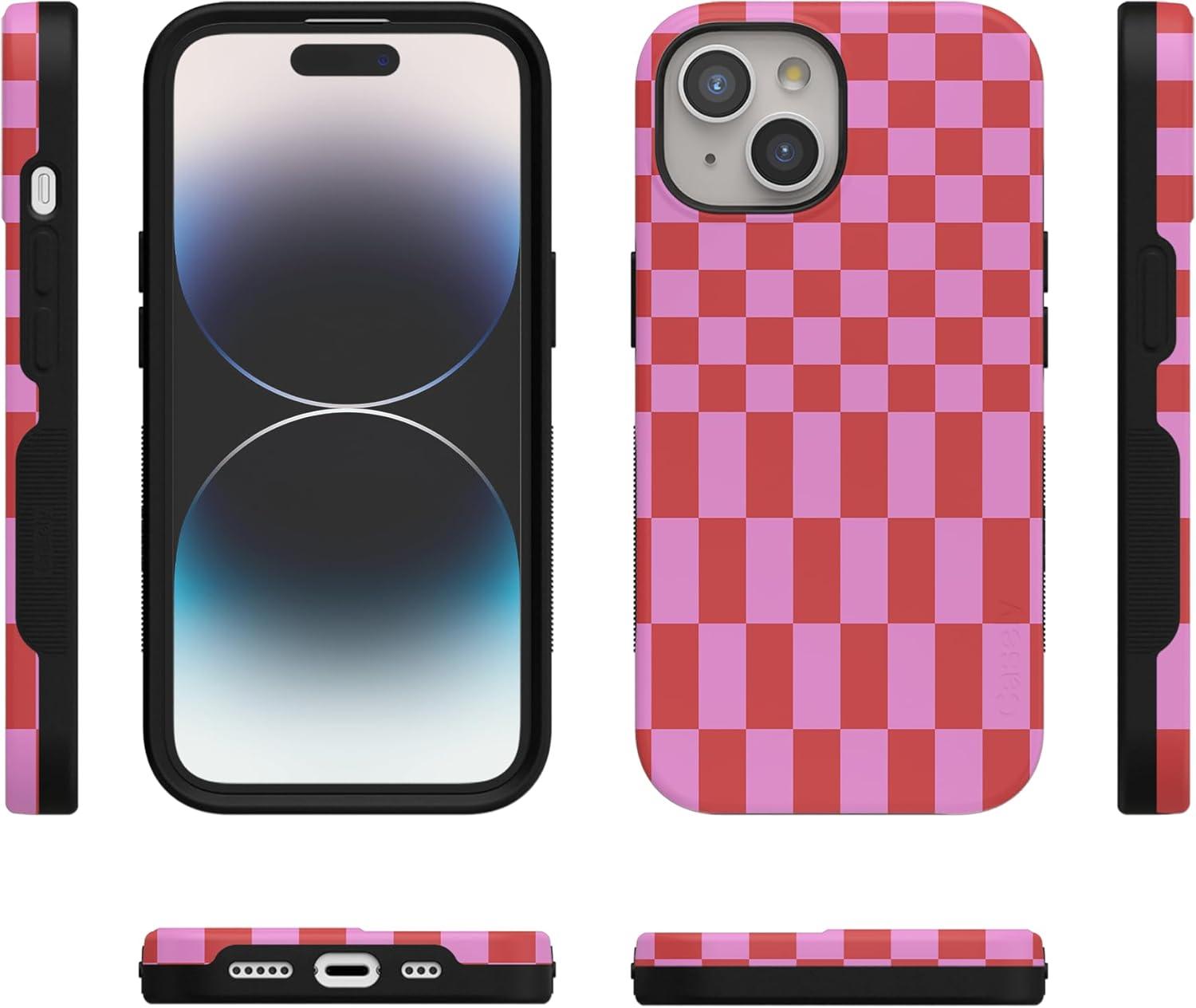 Casely iPhone 15 Case | Be Mine | Tiny Hearts | Bold Protective Design | Compatible with MagSafe(Vibe Check | Pink Checkerboard)