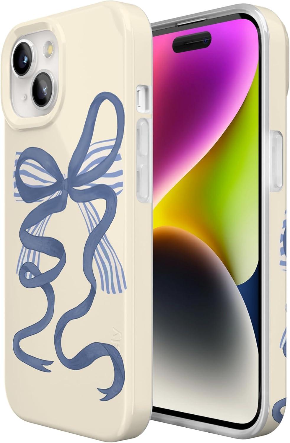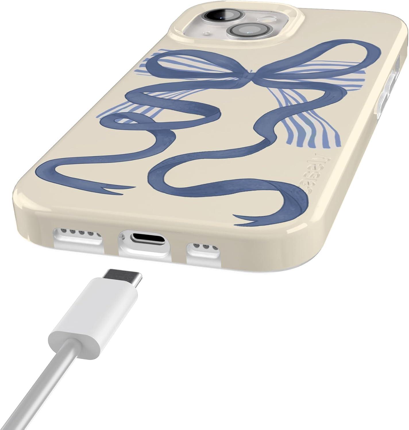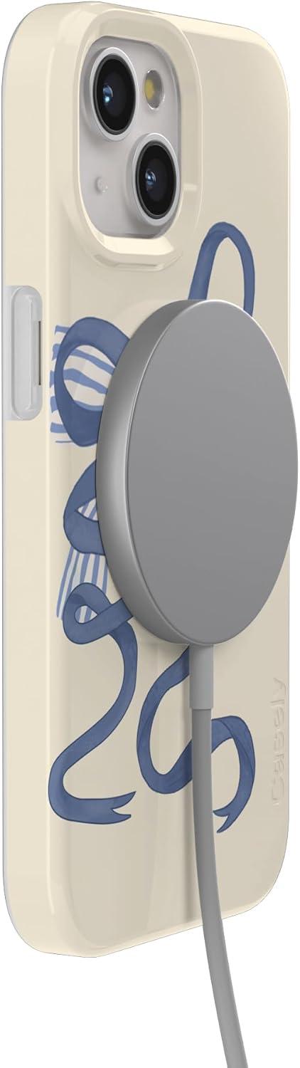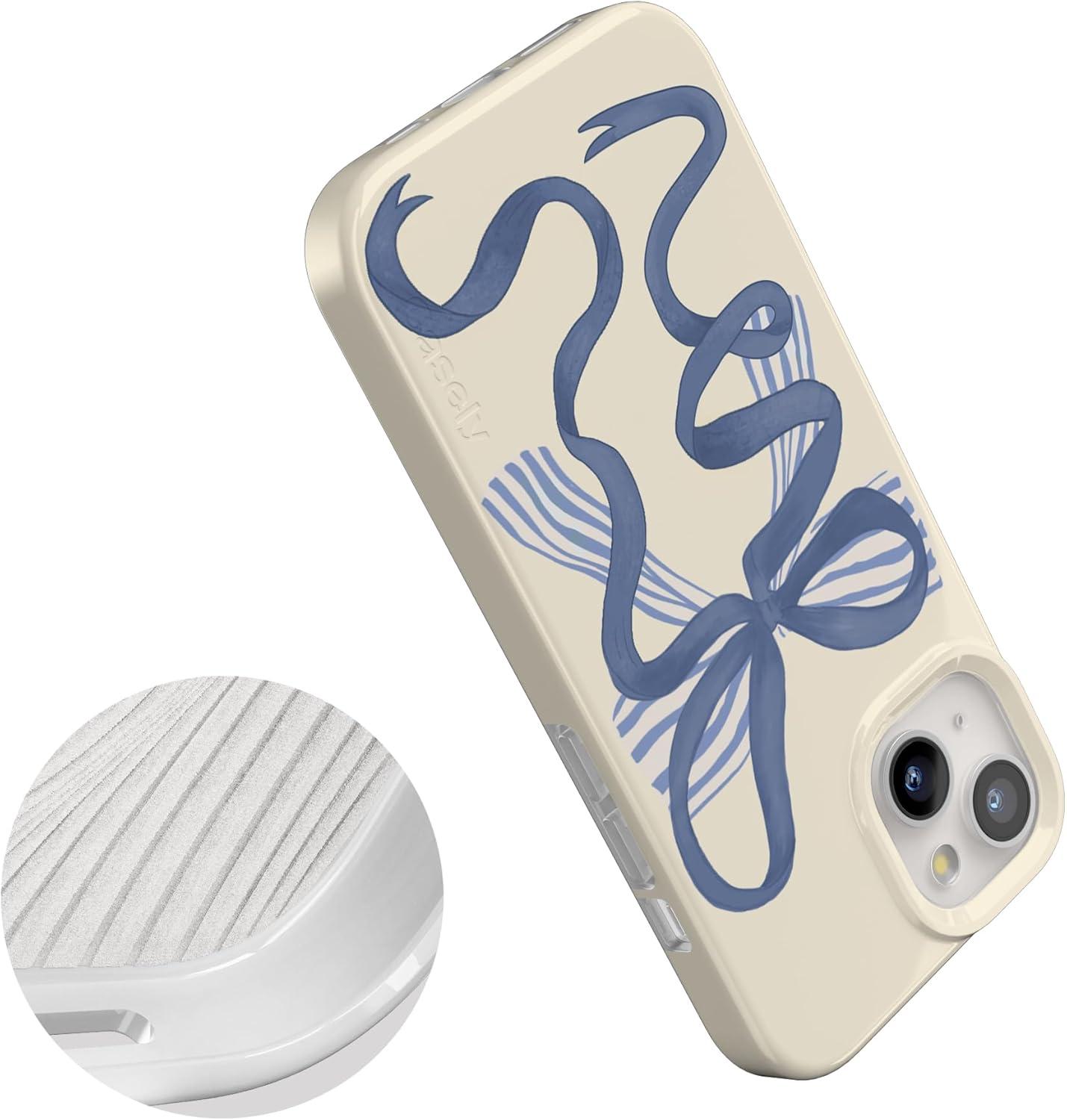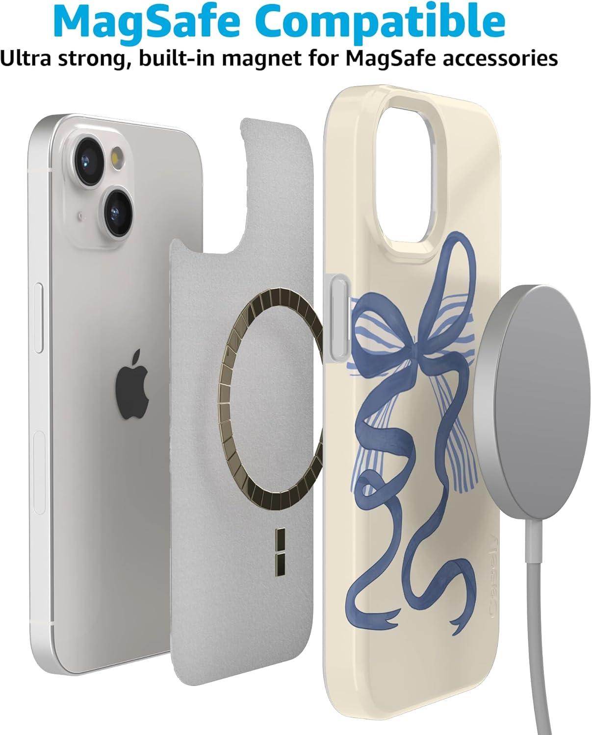 Casely iPhone 15 Case | Falling for You | Plum Floral | Compatible with MagSafe | Classic Ultra Slim Design(Heartstrings | Blue Bow)