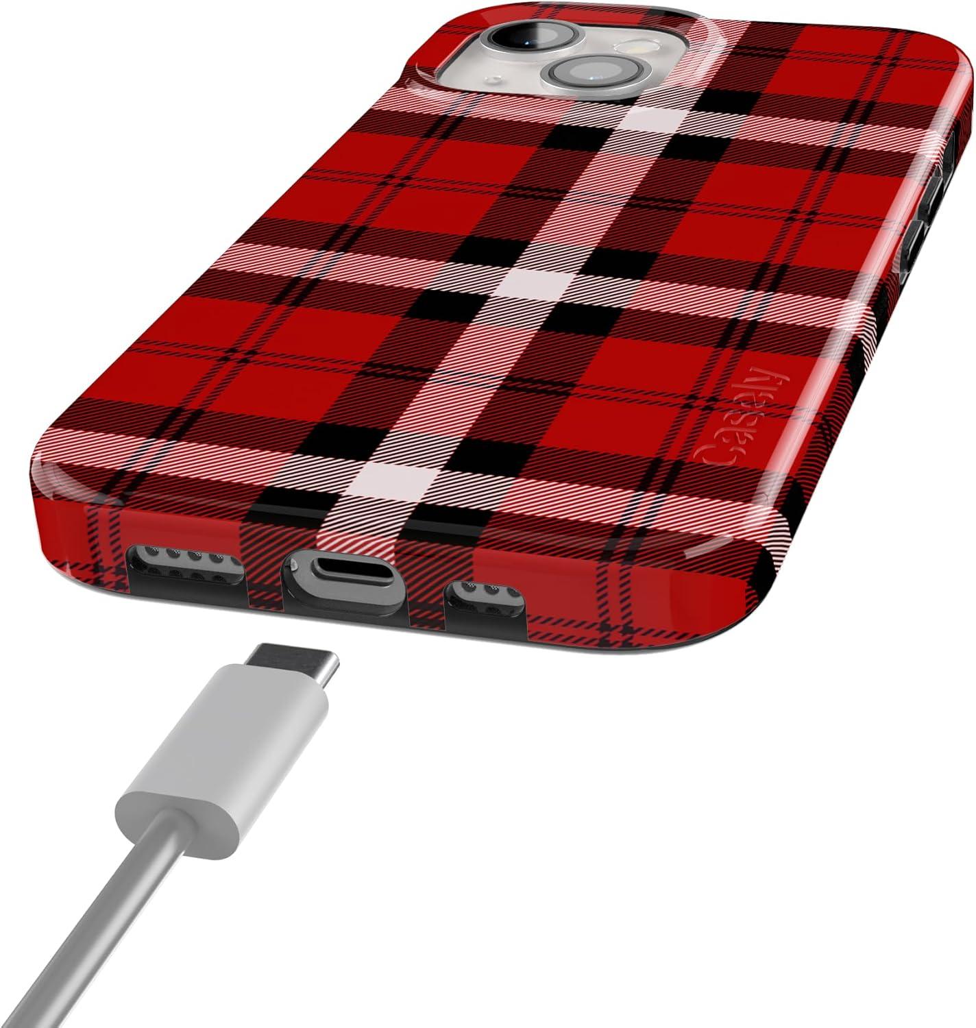 Casely iPhone 15 Case | Hanging Around | Potted Plants Floral | Compatible with MagSafe | Classic Ultra Thin Design(As if! | Red Plaid)