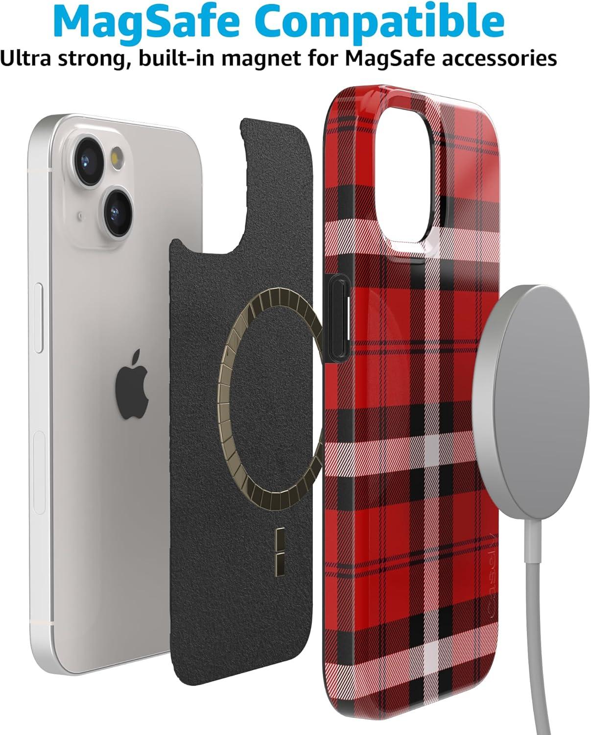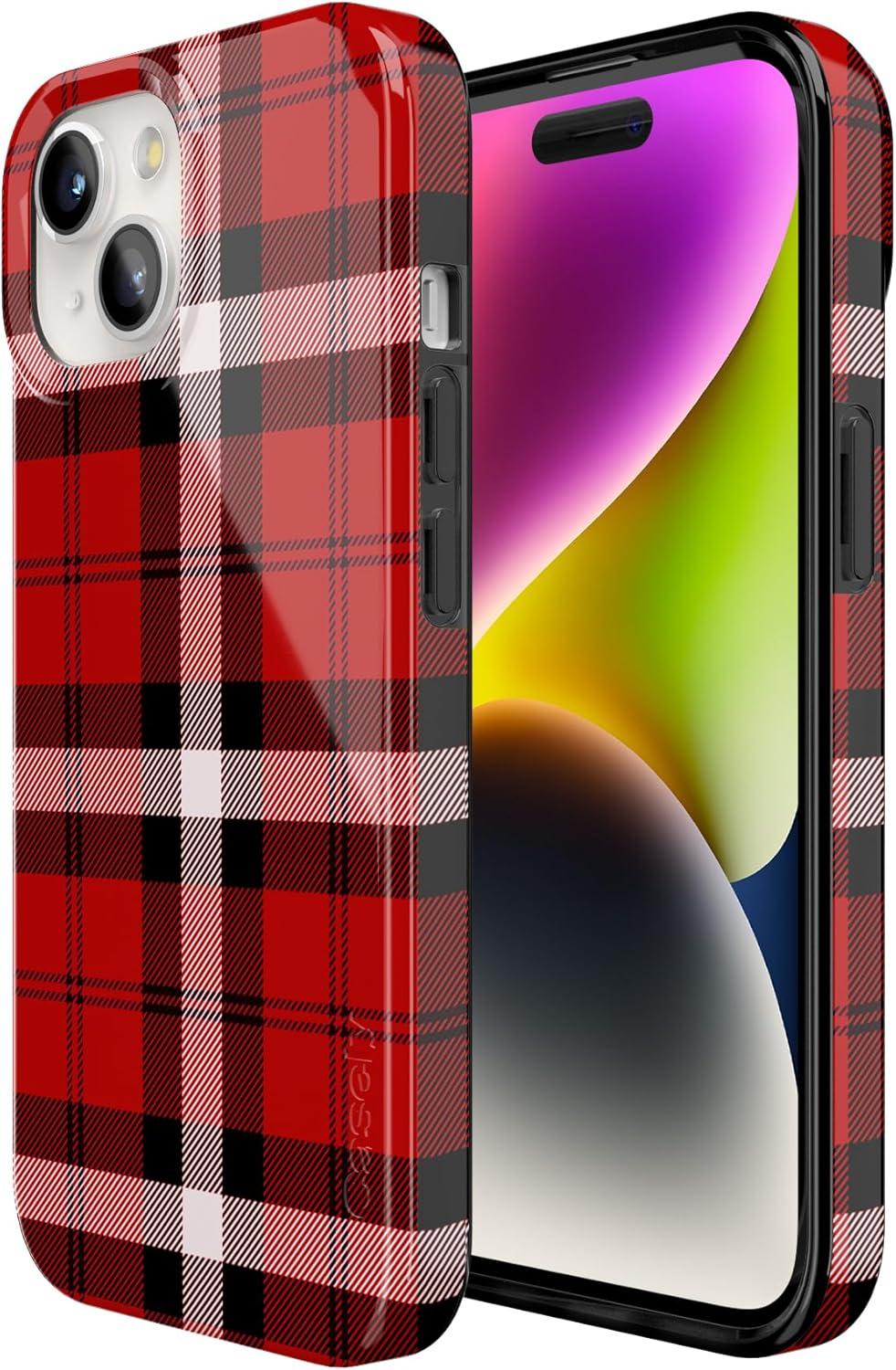 Casely iPhone 15 Case | Sneaky Monkeys | Frida Kahlo Jungle Floral | Compatible with MagSafe | Classic Ultra Thin Design(As if! | Red Plaid)