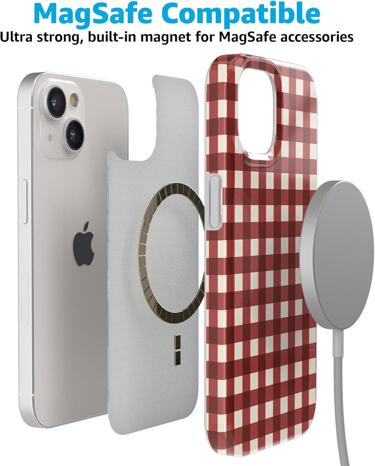 Casely iPhone 15 Case | Sneaky Monkeys | Frida Kahlo Jungle Floral | Compatible with MagSafe | Classic Ultra Thin Design(Checked Twice | Red Plaid)