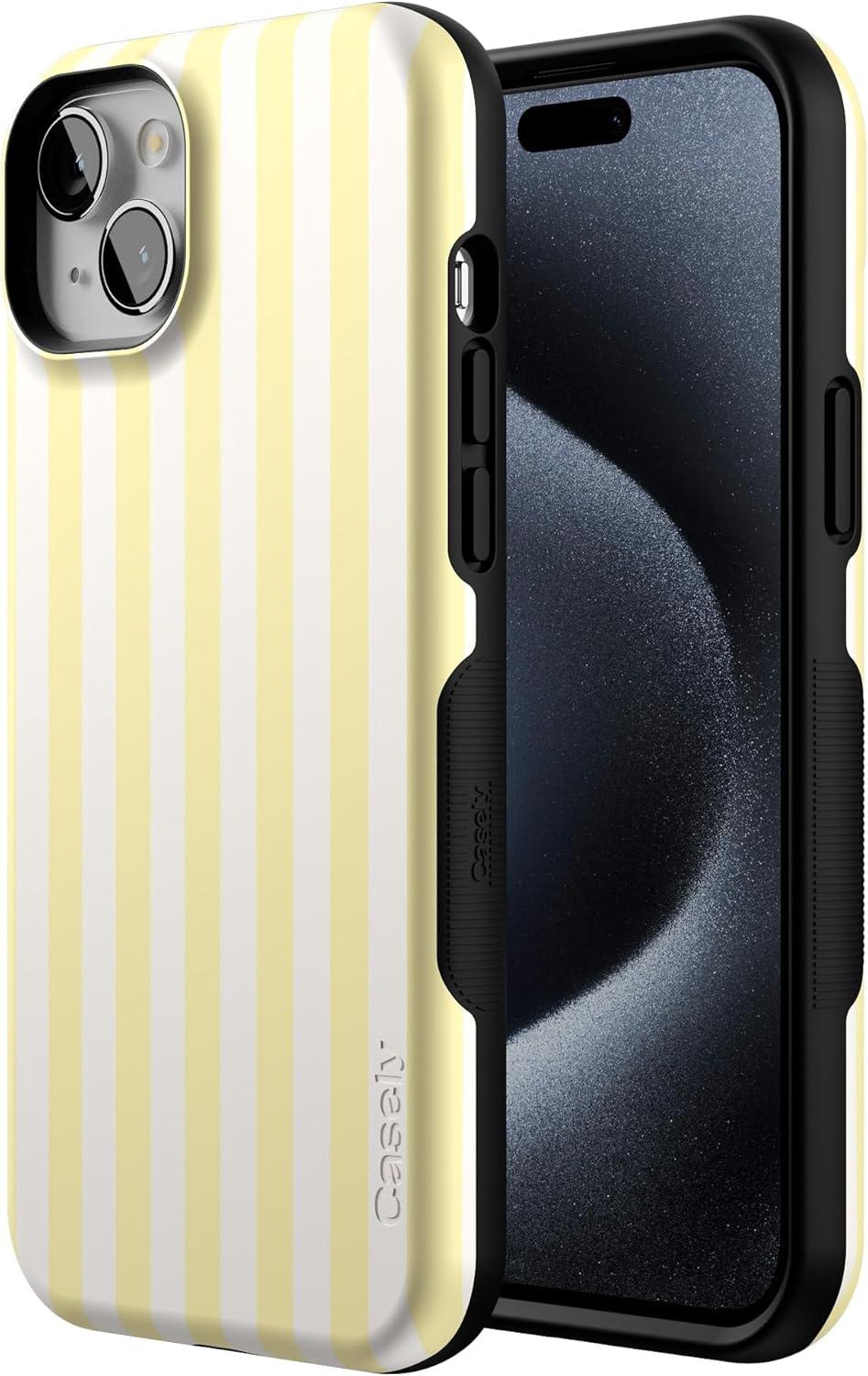 Casely iPhone 15 Case | Twilight Flora | Moody Monochrome | Bold Protective Design | Compatible with MagSafe(Butter Yellow Stripes | Sunday Best)