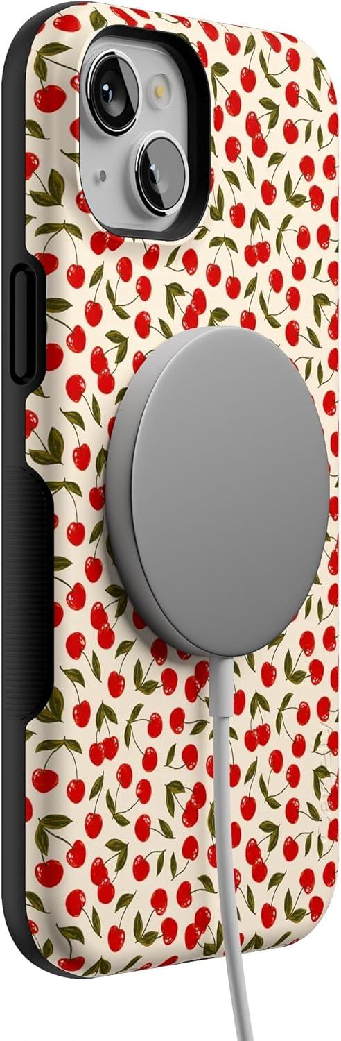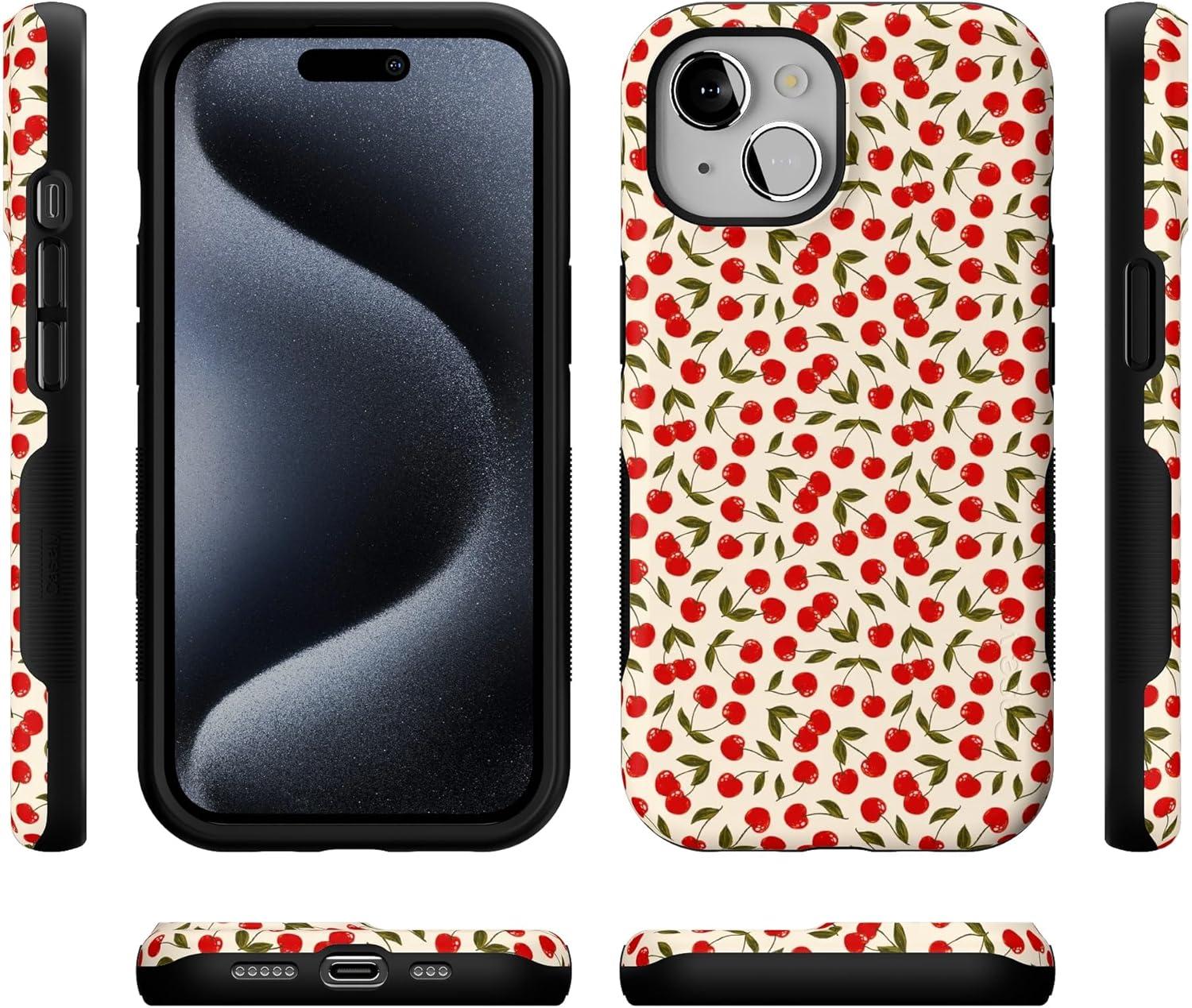 Casely iPhone 15 Case | Twilight Flora | Moody Monochrome | Bold Protective Design | Compatible with MagSafe(Cherry on Top | Red Cherries Floral)