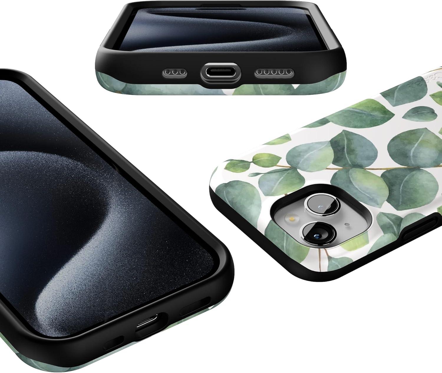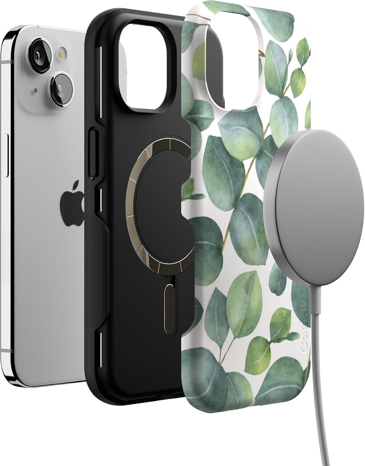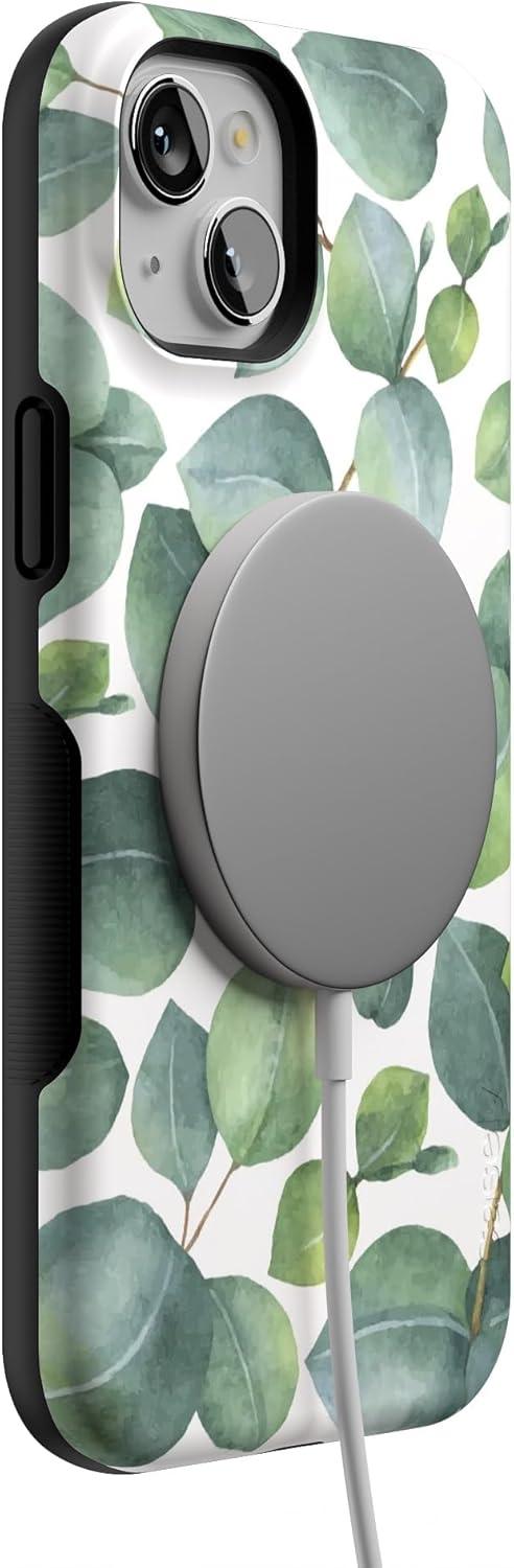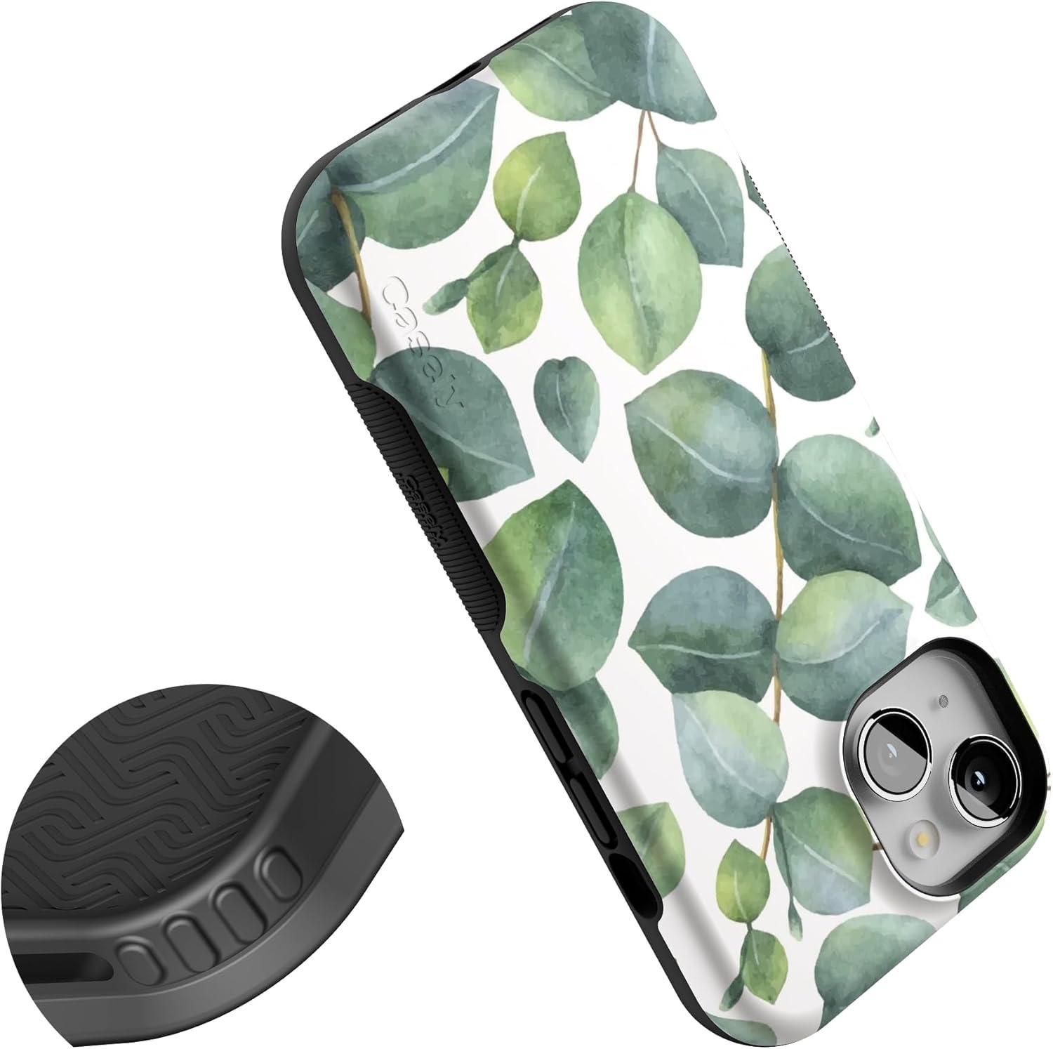 Casely iPhone 15 Case | Twilight Flora | Moody Monochrome | Bold Protective Design | Compatible with MagSafe(Leaf Me Alone | Green Floral Print)