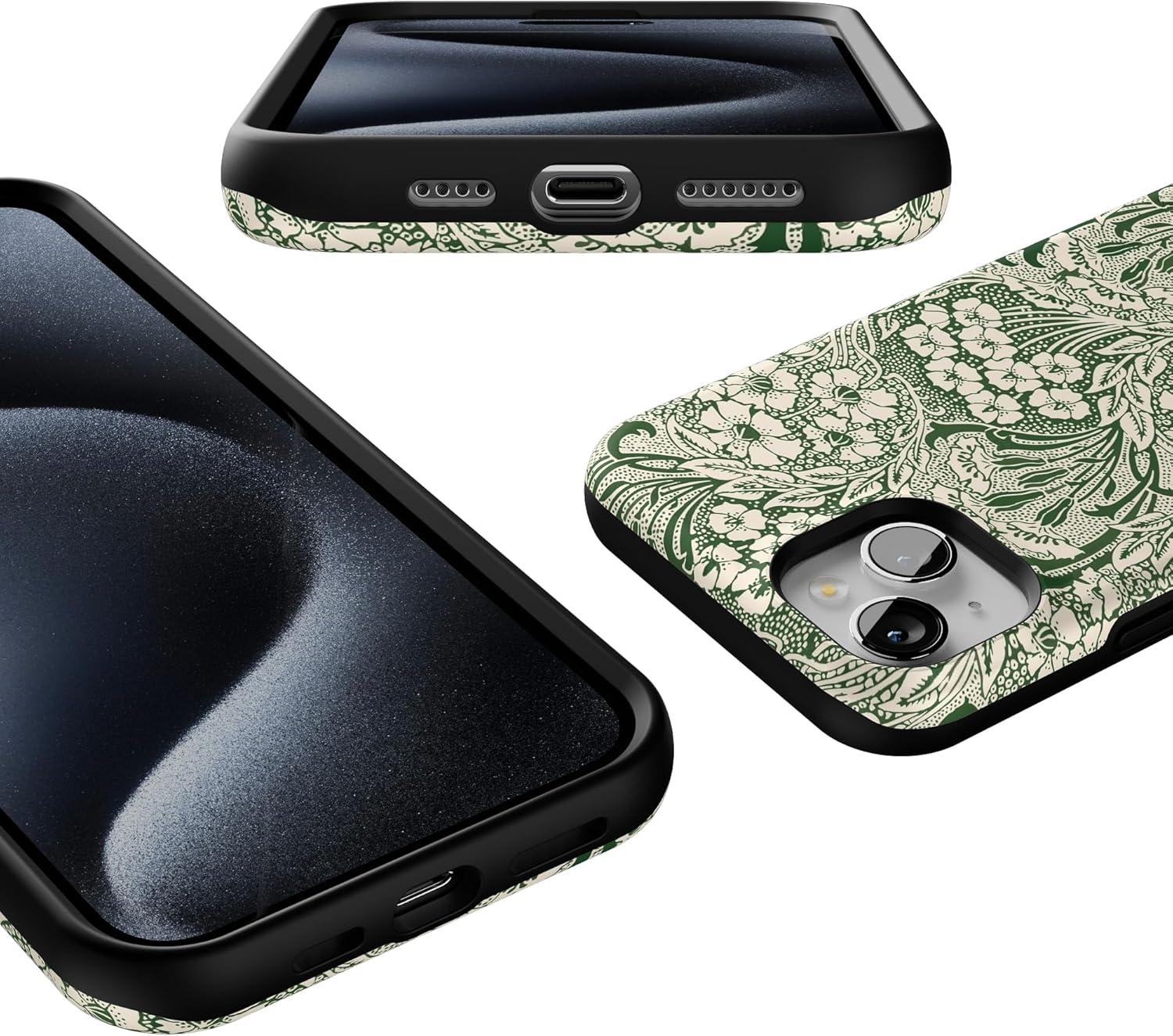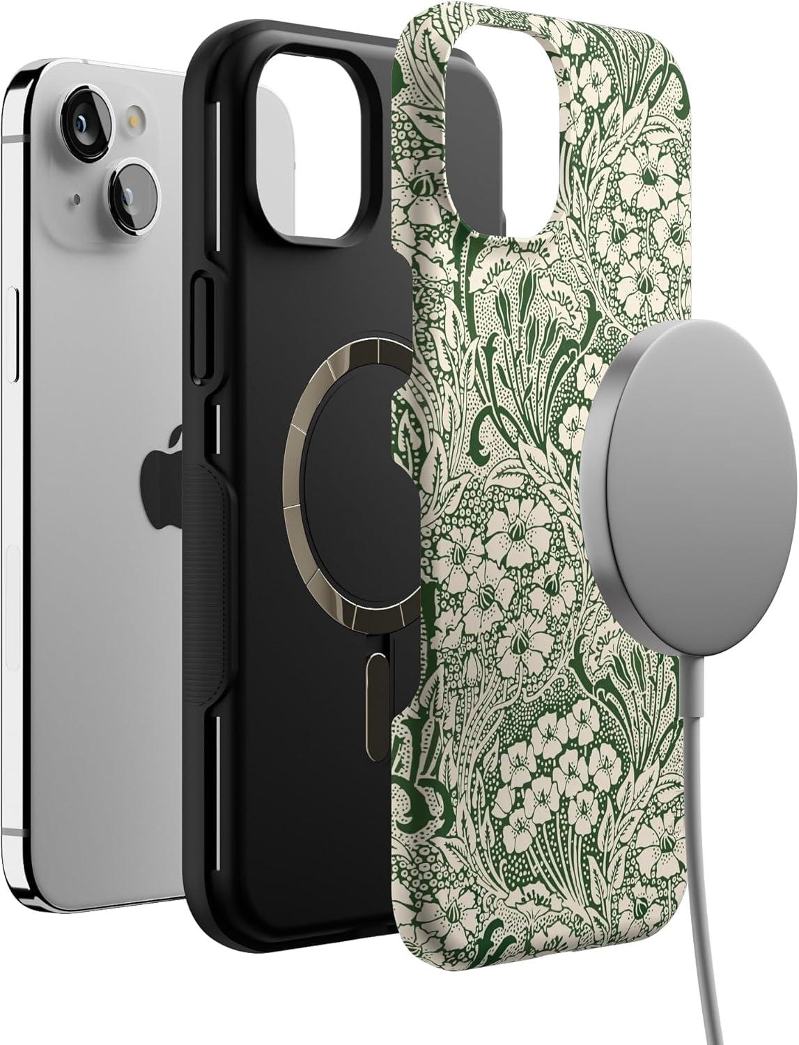 Casely iPhone 15 Case | Twilight Flora | Moody Monochrome | Bold Protective Design | Compatible with MagSafe(Mystic Meadow | Green Gardens)
