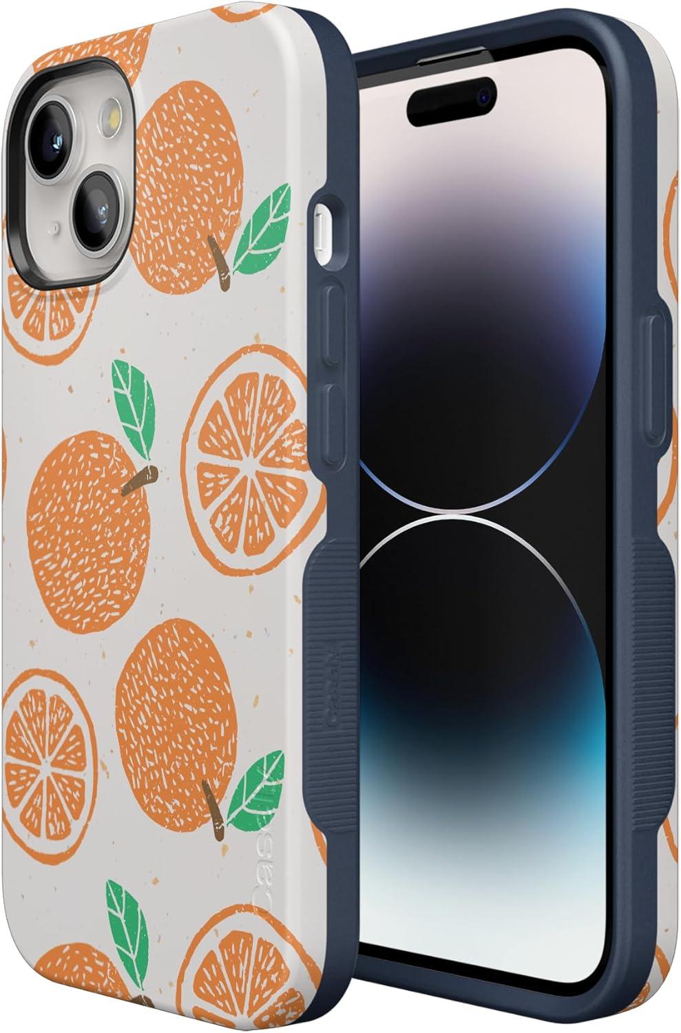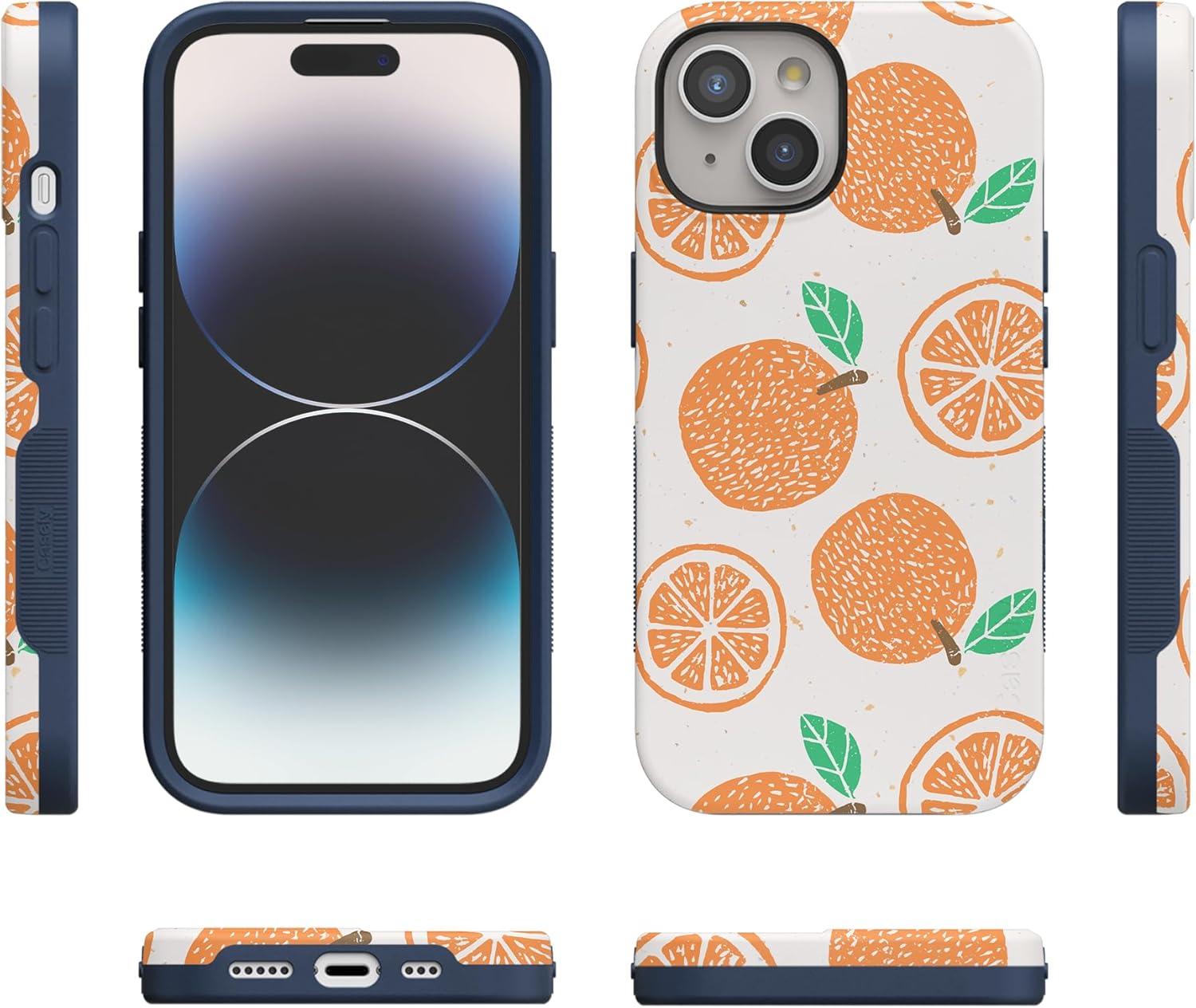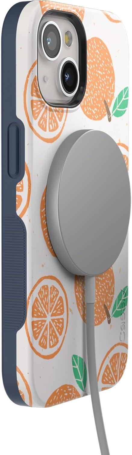 Casely iPhone 15 Plus Case | Navy Floral | Full Bloom | Bold Protective Design | Compatible with MagSafe(Main Squeeze | Orange Stamped)