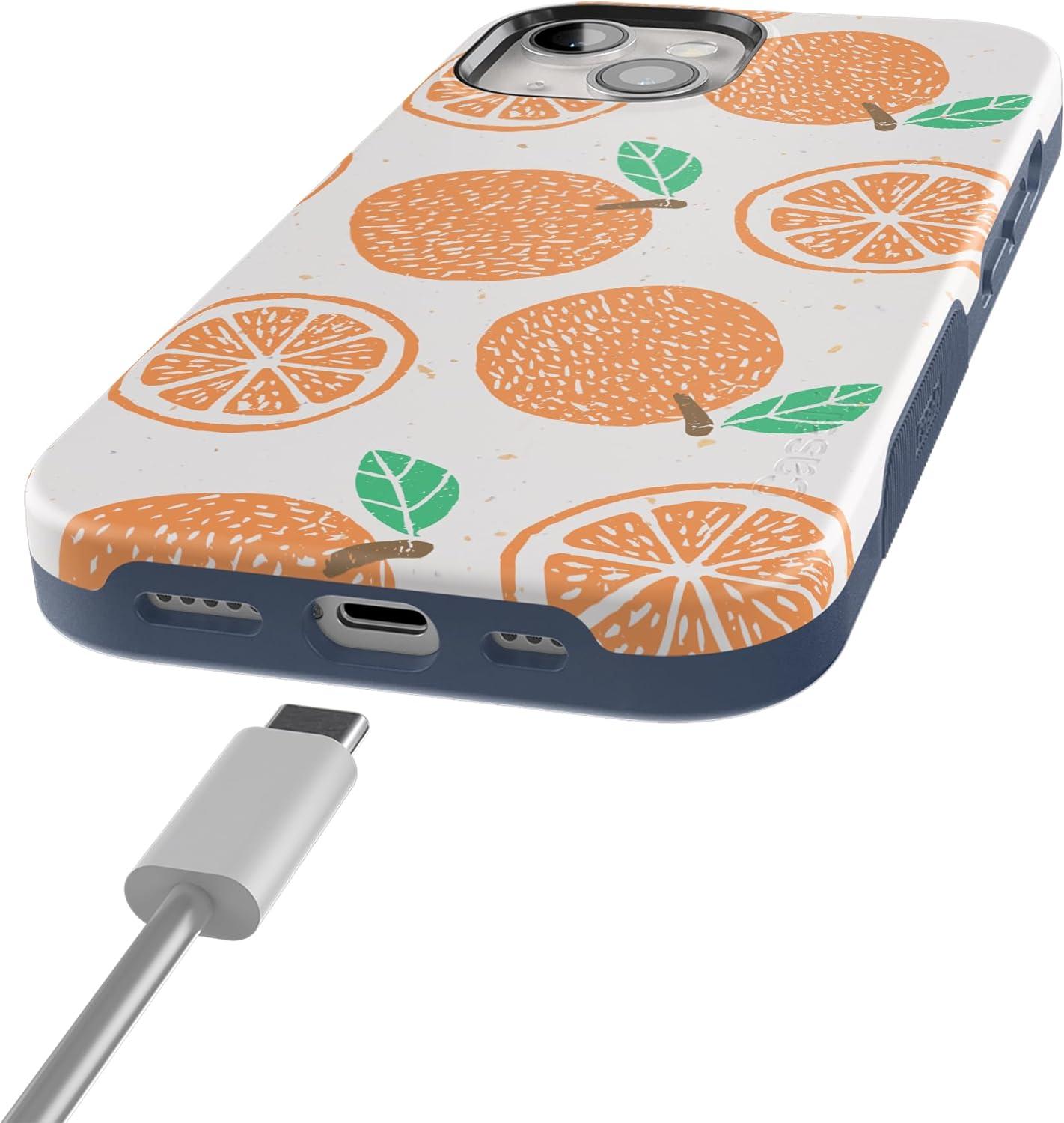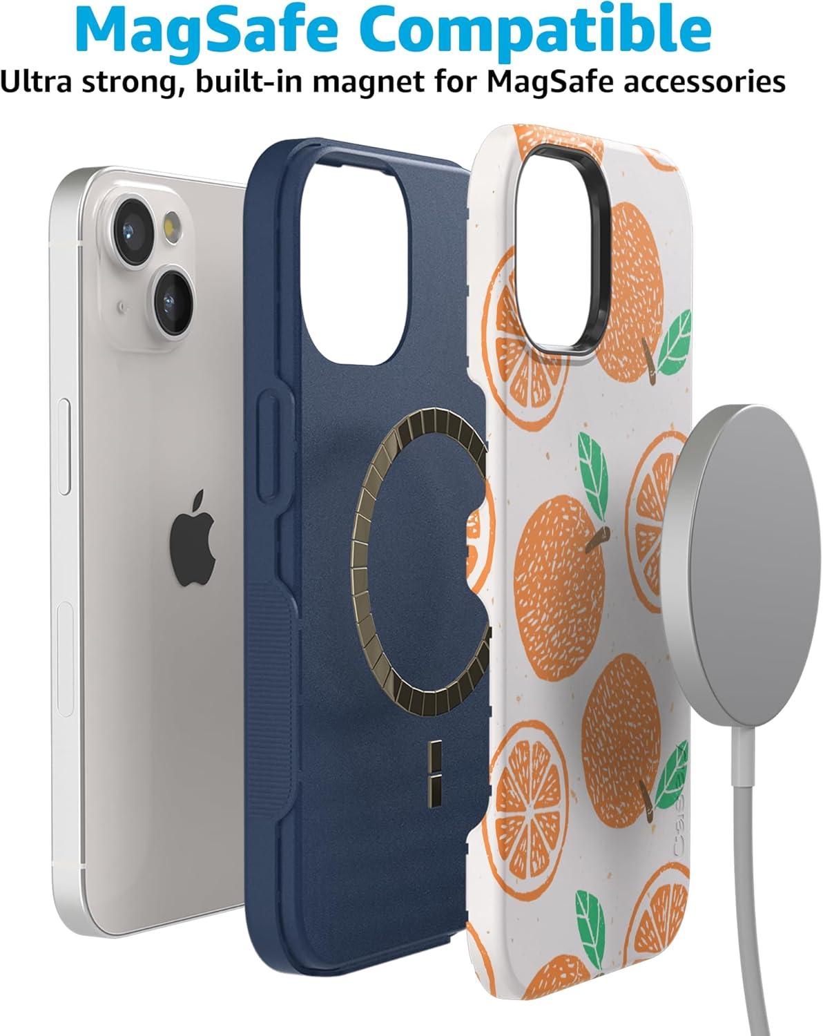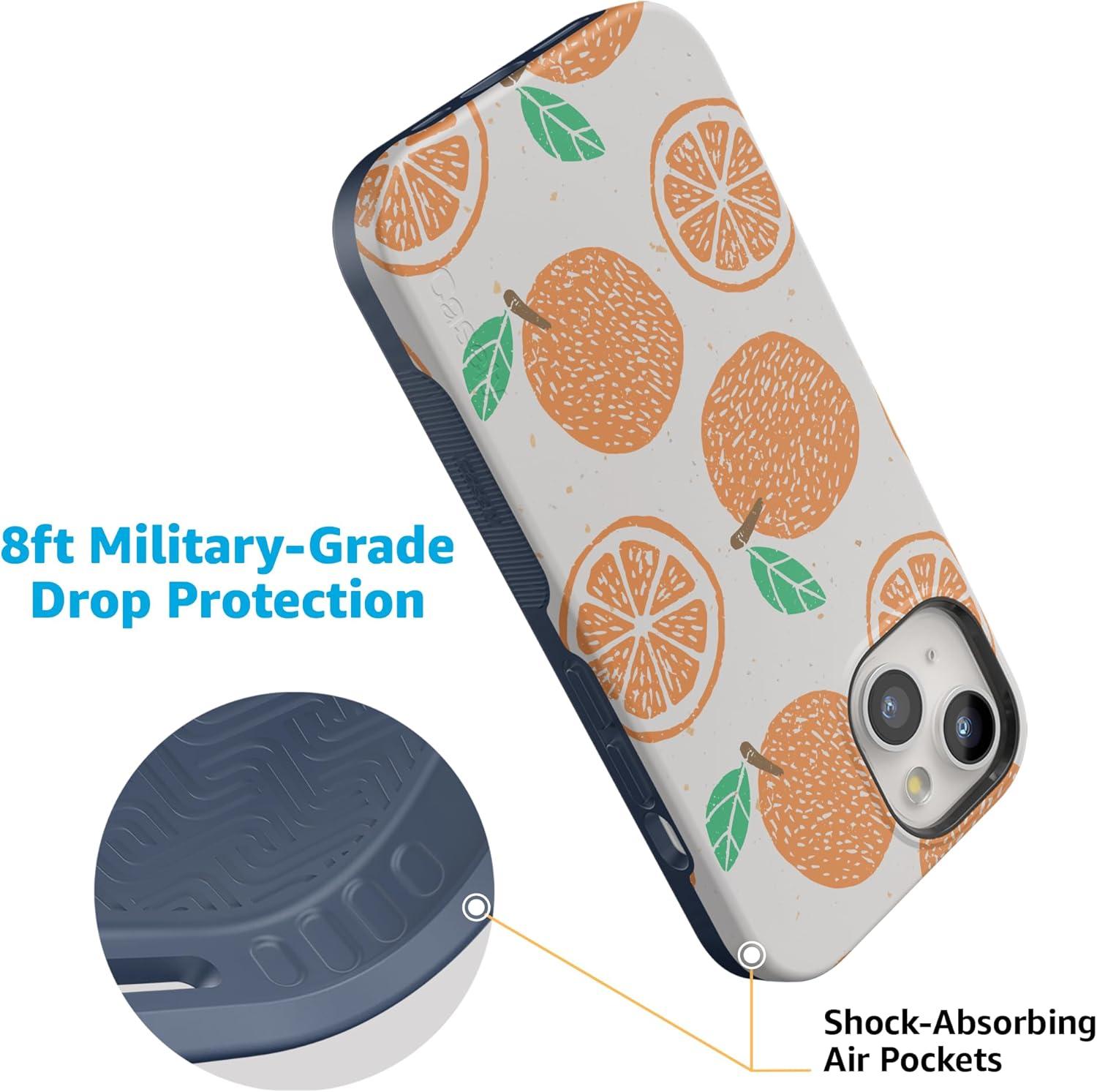 Casely iPhone 15 Plus Case | Navy Floral | Full Bloom | Bold Protective Design | Compatible with MagSafe(Main Squeeze | Orange Stamped)
