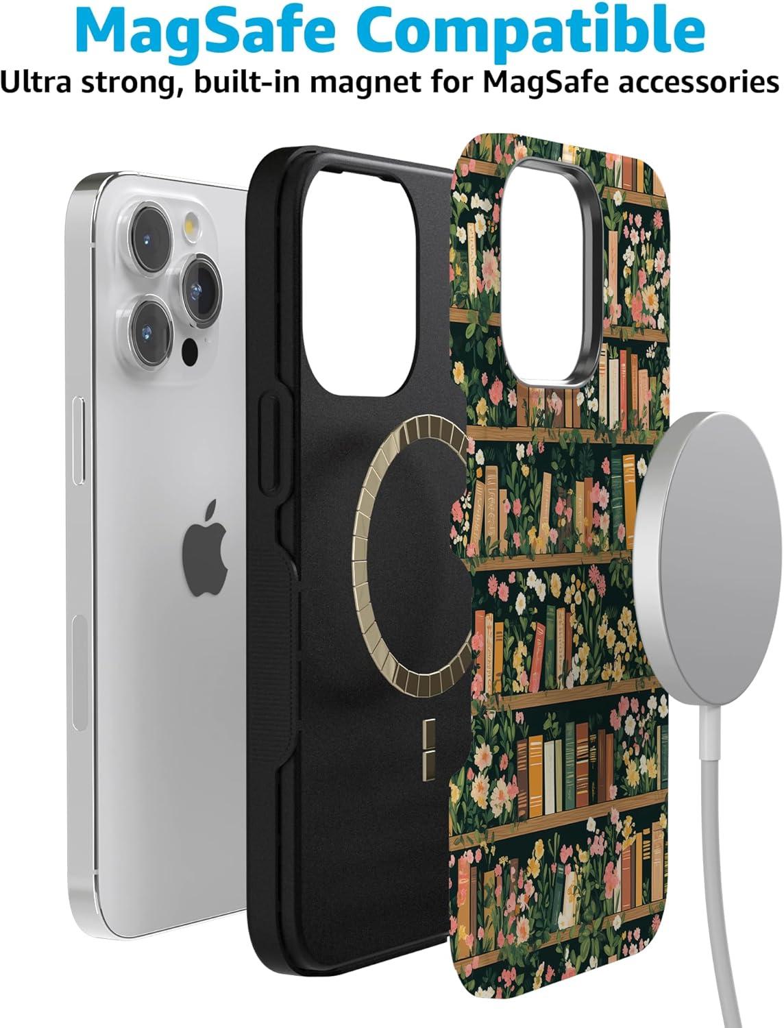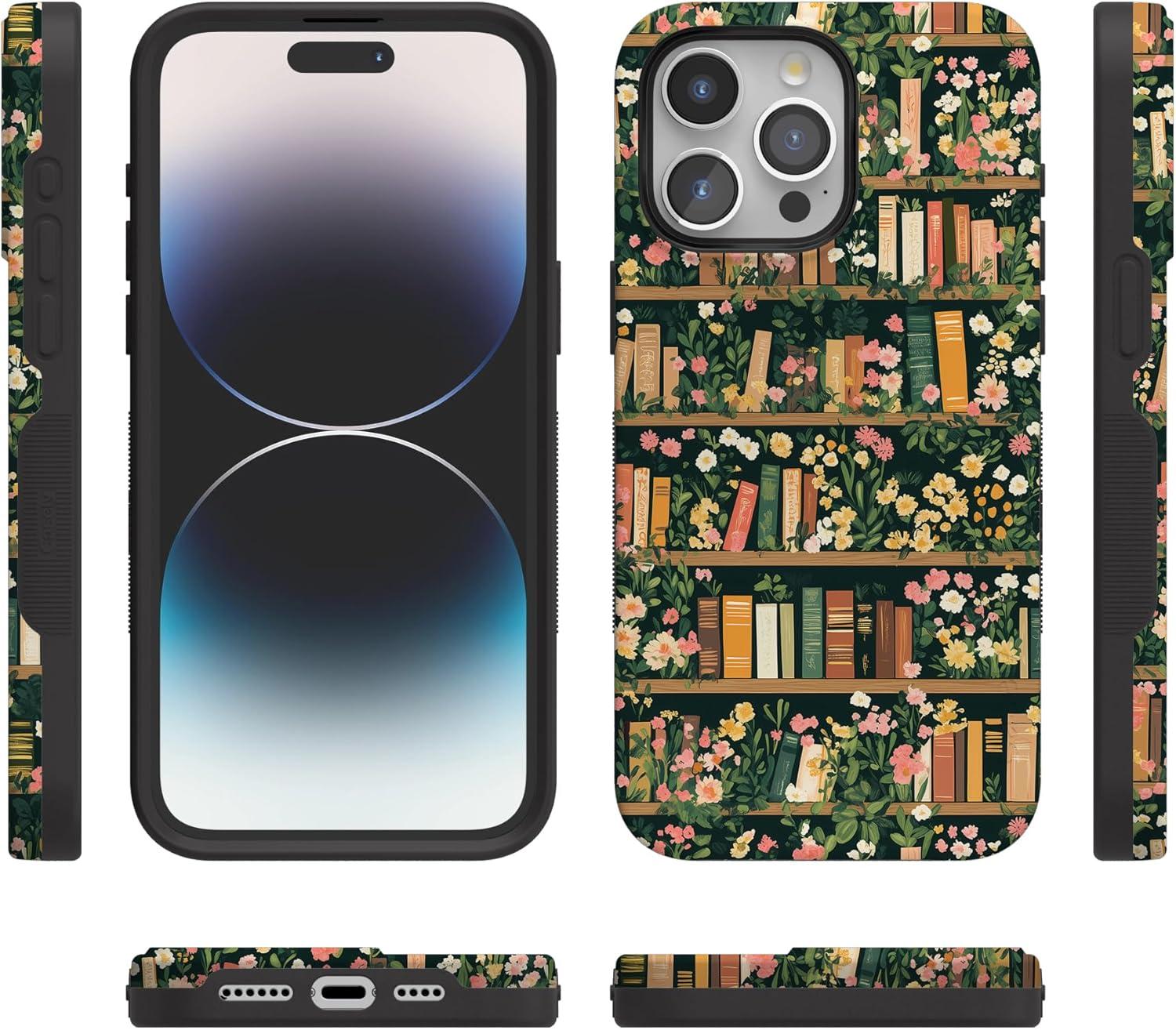 Casely iPhone 15 Pro Max Case | Kiwi Kiss | Matcha Green Shimmer Glitter | Bold Protective Design | Compatible with MagSafe(Book Nook | Floral Library)