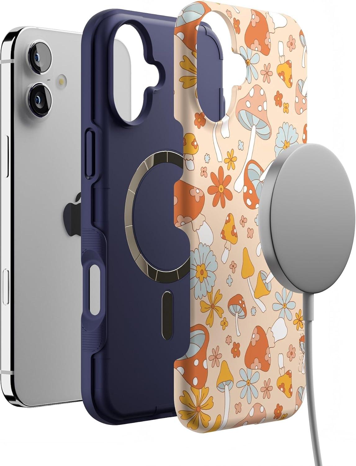 Casely iPhone 16 Case | All Smiles | Smiley Face Sticker | Bold Protective Design | MagSafe Compatible Design(Mushroom Magic | Retro Floral)