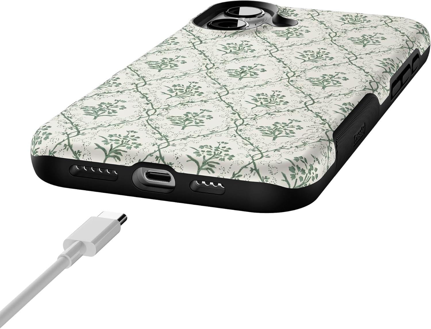 Casely iPhone 16 Case | All Smiles | Smiley Face Sticker | Bold Protective Design | MagSafe Compatible Design(Sage Tapestry | Floral Vines)
