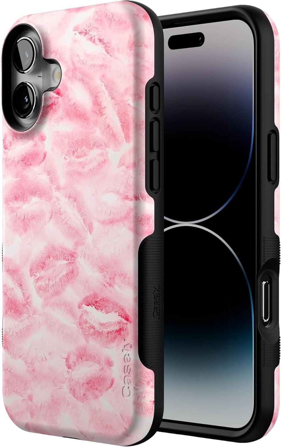 Casely iPhone 16 Case | All Smiles | Smiley Face Sticker | Bold Protective Design | MagSafe Compatible Design(Sealed with a Kiss | Pink Lipstick)