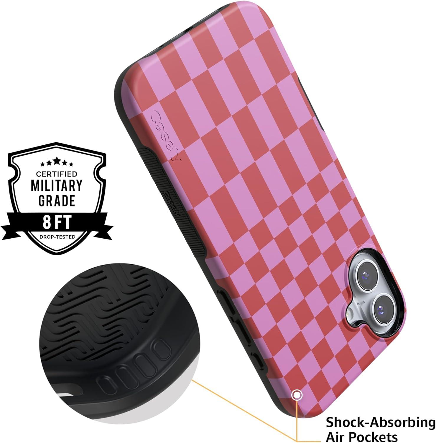 Casely iPhone 16 Case | All Smiles | Smiley Face Sticker | Bold Protective Design | MagSafe Compatible Design(Vibe Check | Pink Checkerboard)