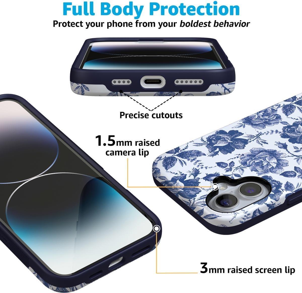 Casely iPhone 16 Case | Botanical Blooms | Floral Patchwork | Compatible with MagSafe | Bold Protective Design(Rose to Fame | Blue & White Rose Floral)