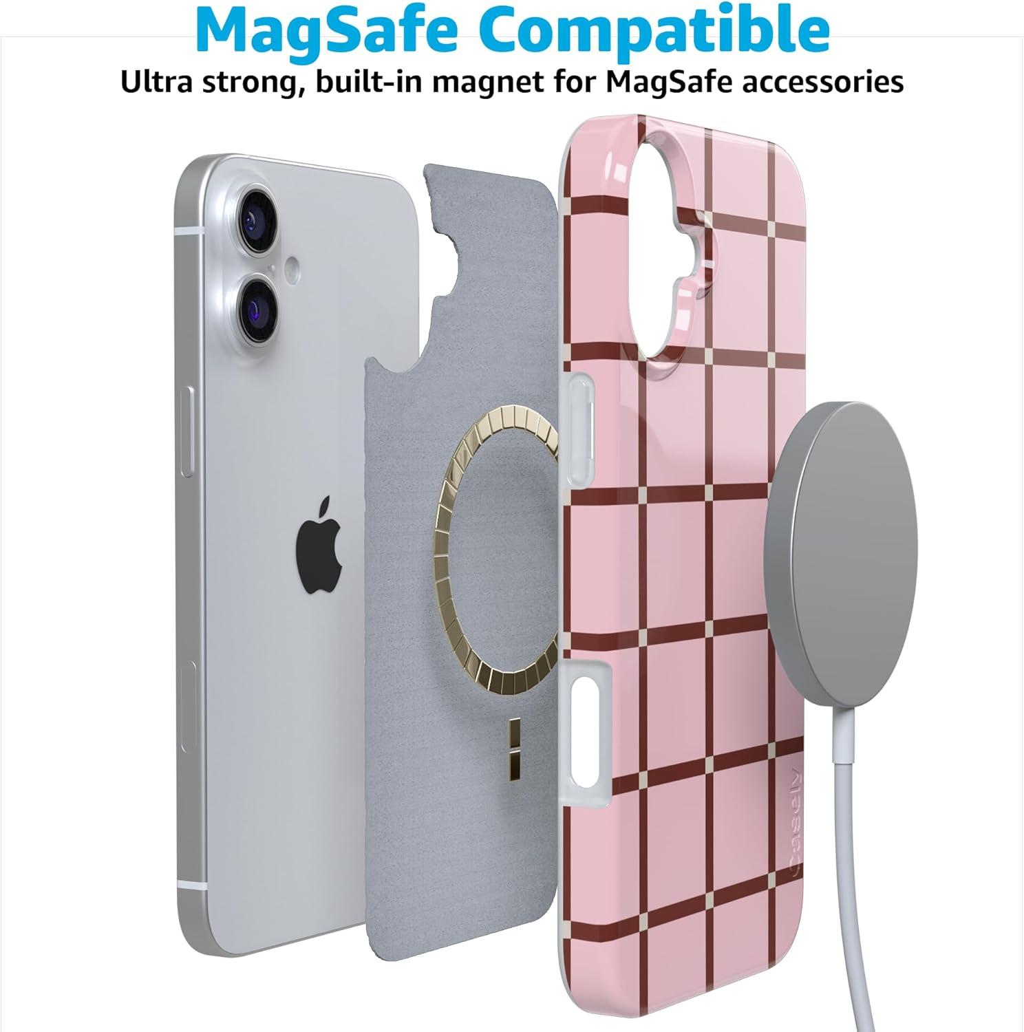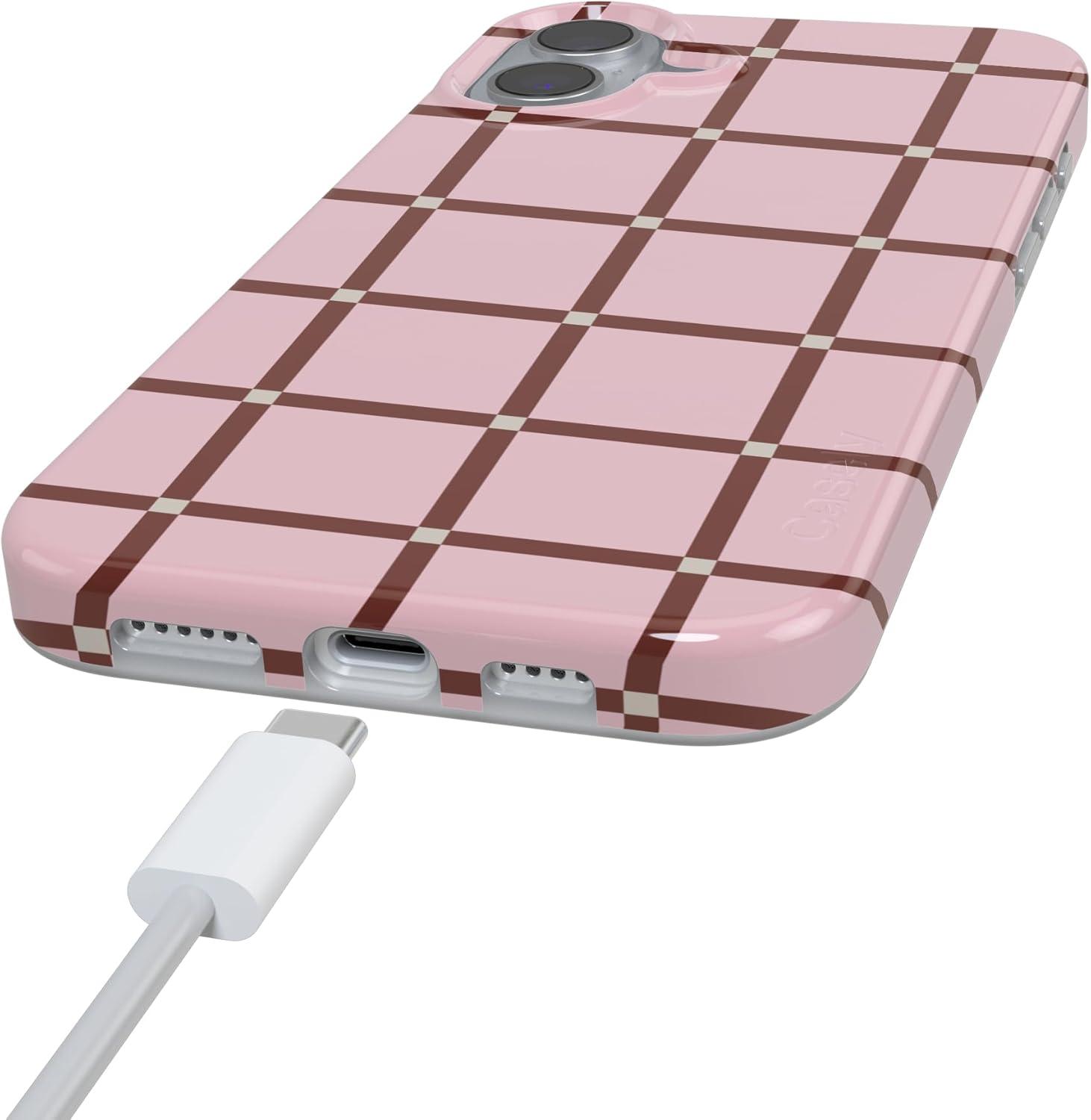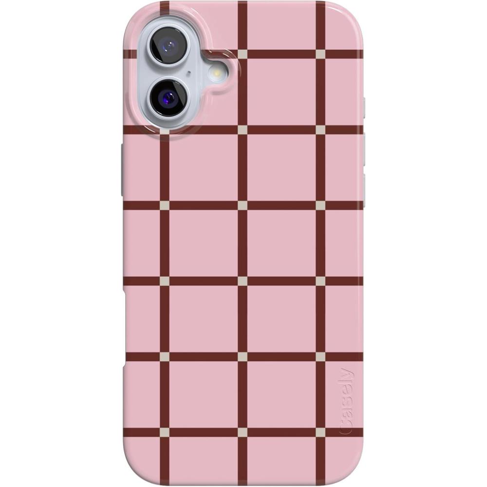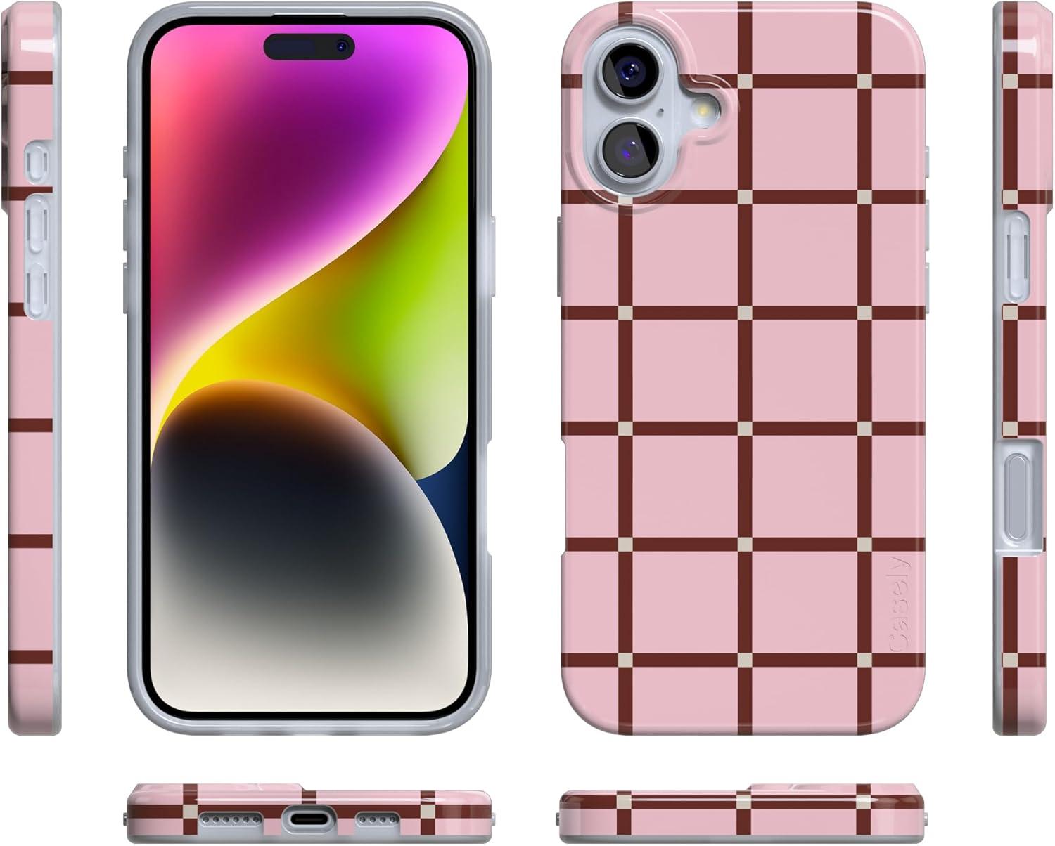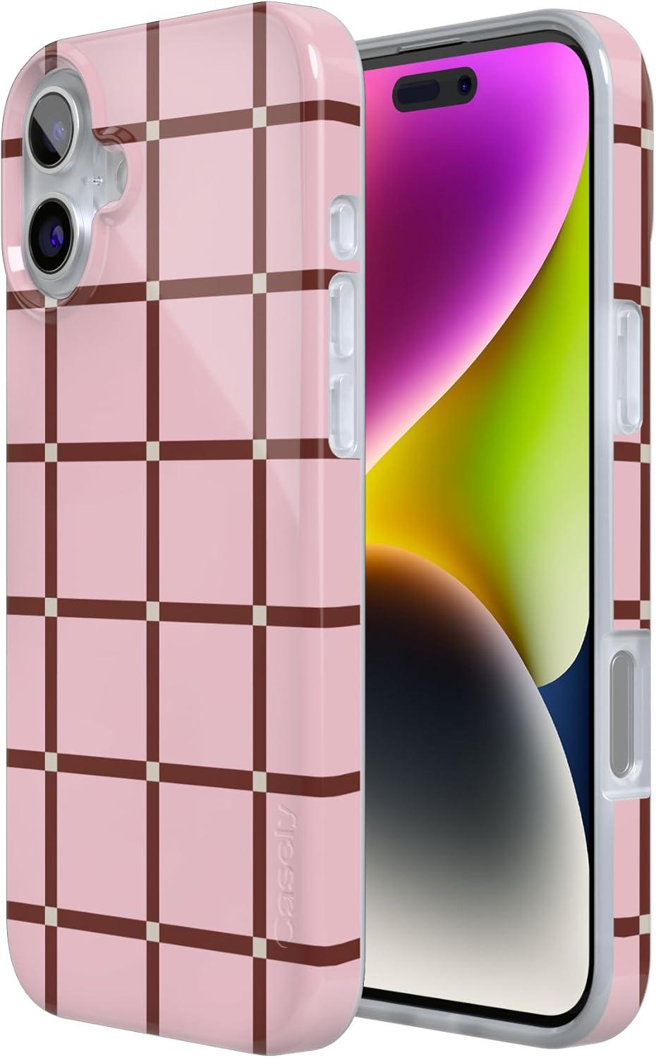 Casely iPhone 16 Case | Nantucket Cottage | Blue Hydrangea | Compatible with MagSafe | Classic Ultra Slim Design(Uptown Gridlock | Pink Checkerboard)