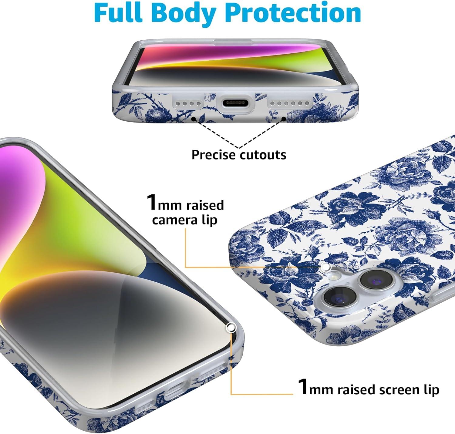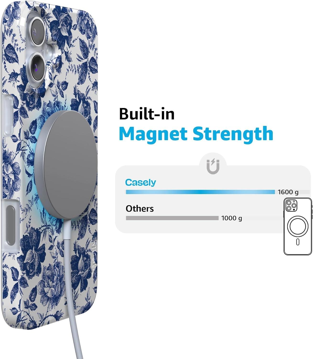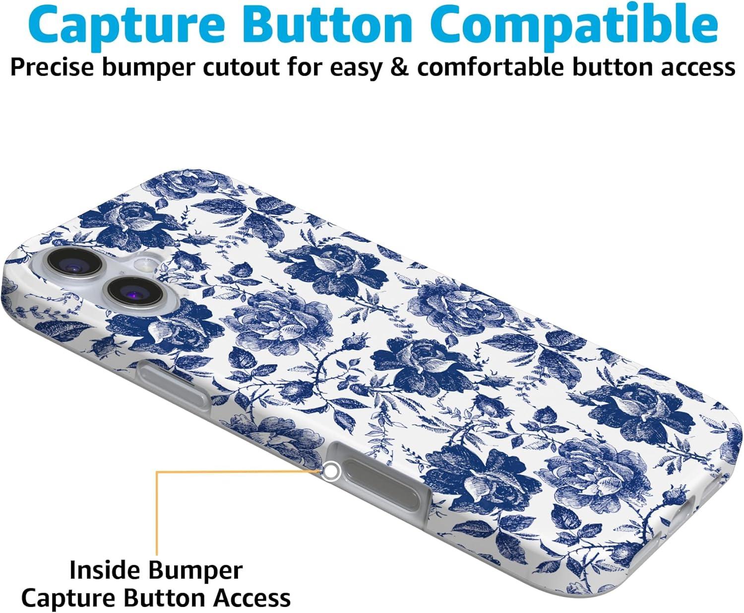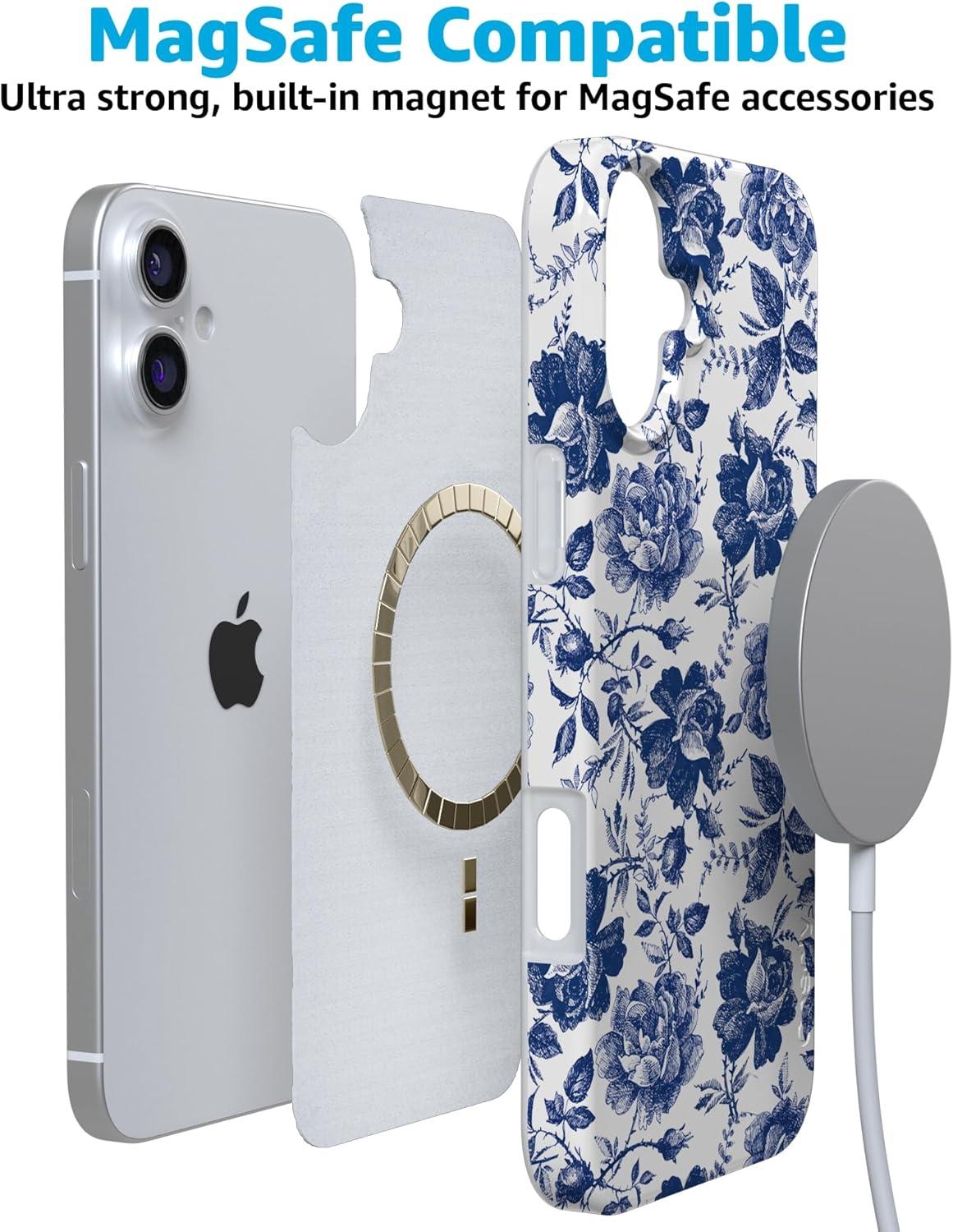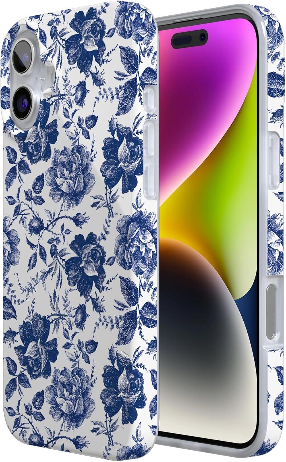 Casely iPhone 16 Case | Van Gogh | Head of a Skeleton with a Burning Cigarette Phone | Classic Ultra-Slim Design | Compatible with MagSafe(Rose to Fame | Blue & White Rose Floral)