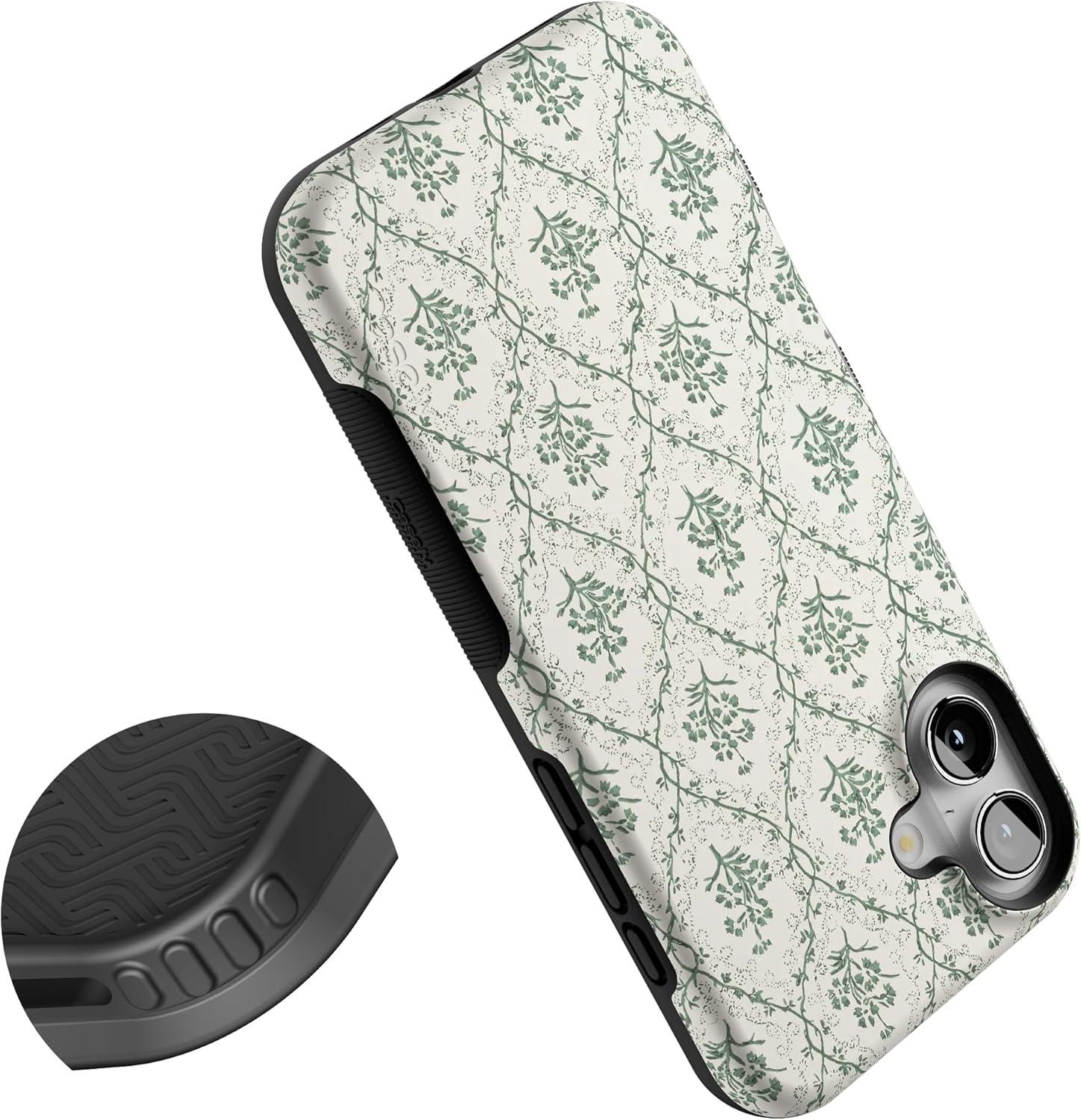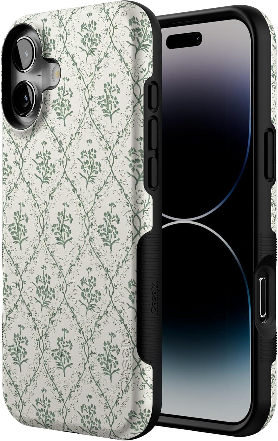 Casely iPhone 16 Plus Case | Bordeaux Rose | Moody Monochrome | Bold Protective Design | Compatible with MagSafe(Sage Tapestry | Floral Vines)