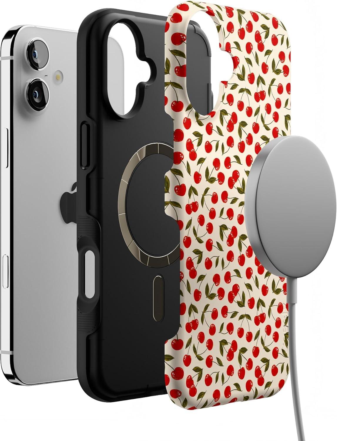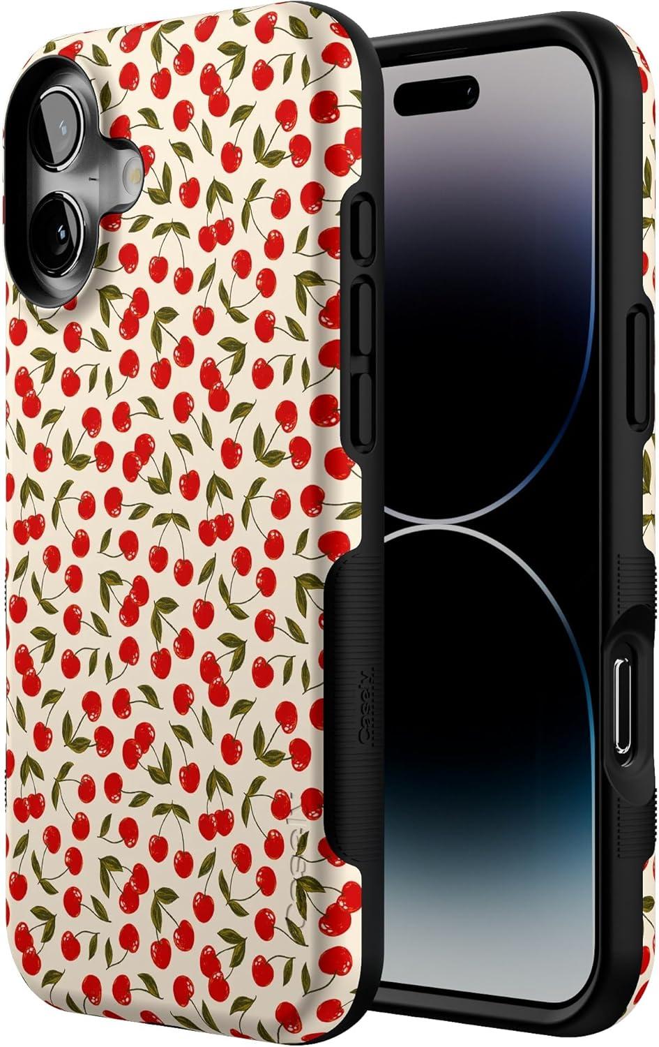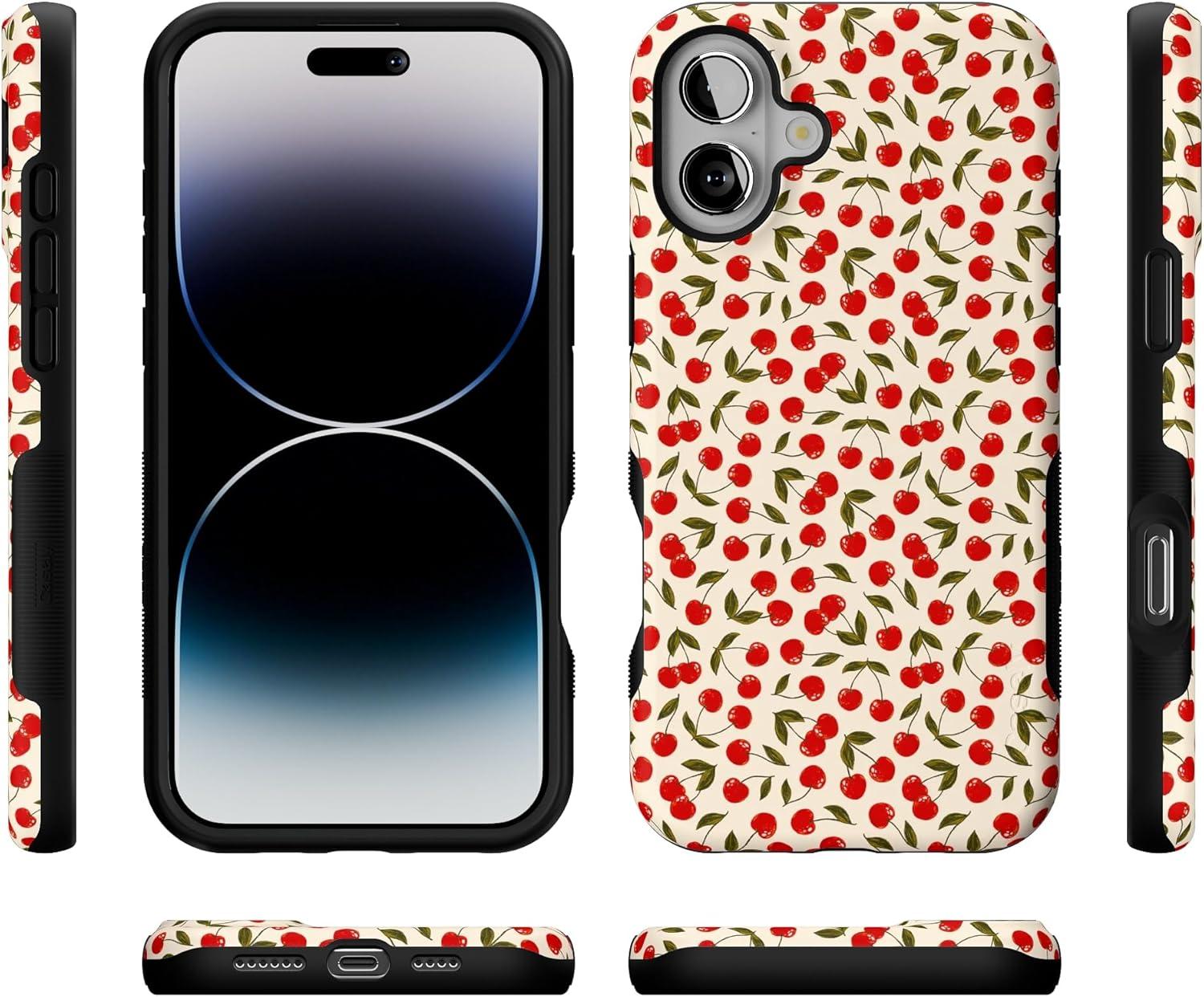 Casely iPhone 16 Plus Case | Poppy Meadows | Pastel Floral | Compatible with MagSafe | Bold Protective Design(Cherry on Top | Red Cherries)