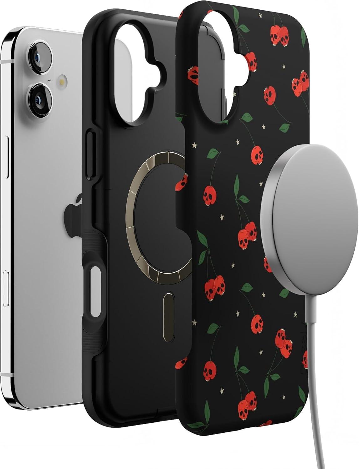 Casely iPhone 16 Plus Case | Twilight Flora | Moody Monochrome | Bold Protective Design | Compatible with MagSafe(Sweet Revenge | Cherry Skulls)