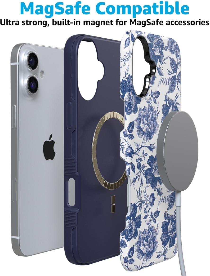 Casely iPhone 16 Plus Case | Van Gogh | Skull of a Skeleton with Burning Cigarette | Bold Protective Design | Compatible with MagSafe(Rose to Fame | Blue & White Rose Floral)