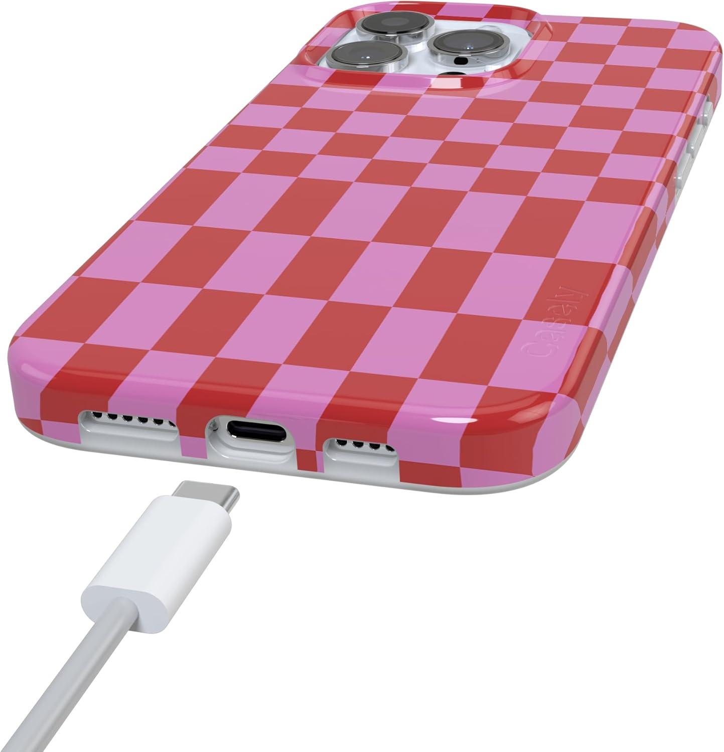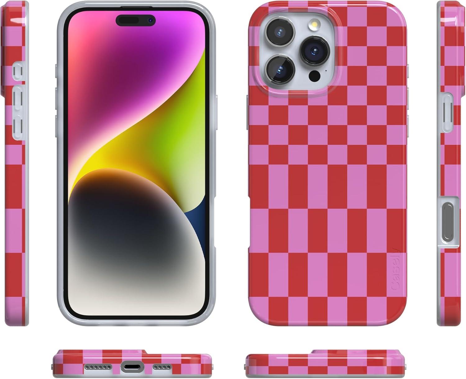 Casely iPhone 16 Pro Case | Moody Monochrome | in The Grove | Compatible with MagSafe | Classic Ultra Thin Design(Vibe Check | Pink Checkerboard)