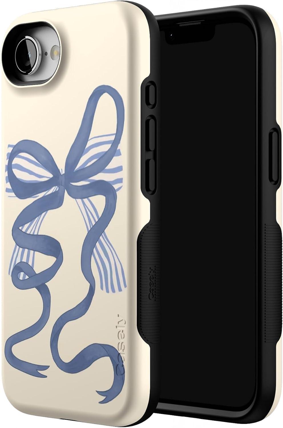 Casely iPhone 16e Case | Pretty in Pastel | Blush Stripes | Bold Protective Design | Compatible with MagSafe(Heartstrings | Blue Bow)