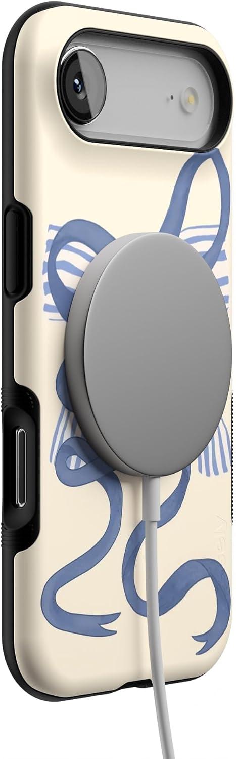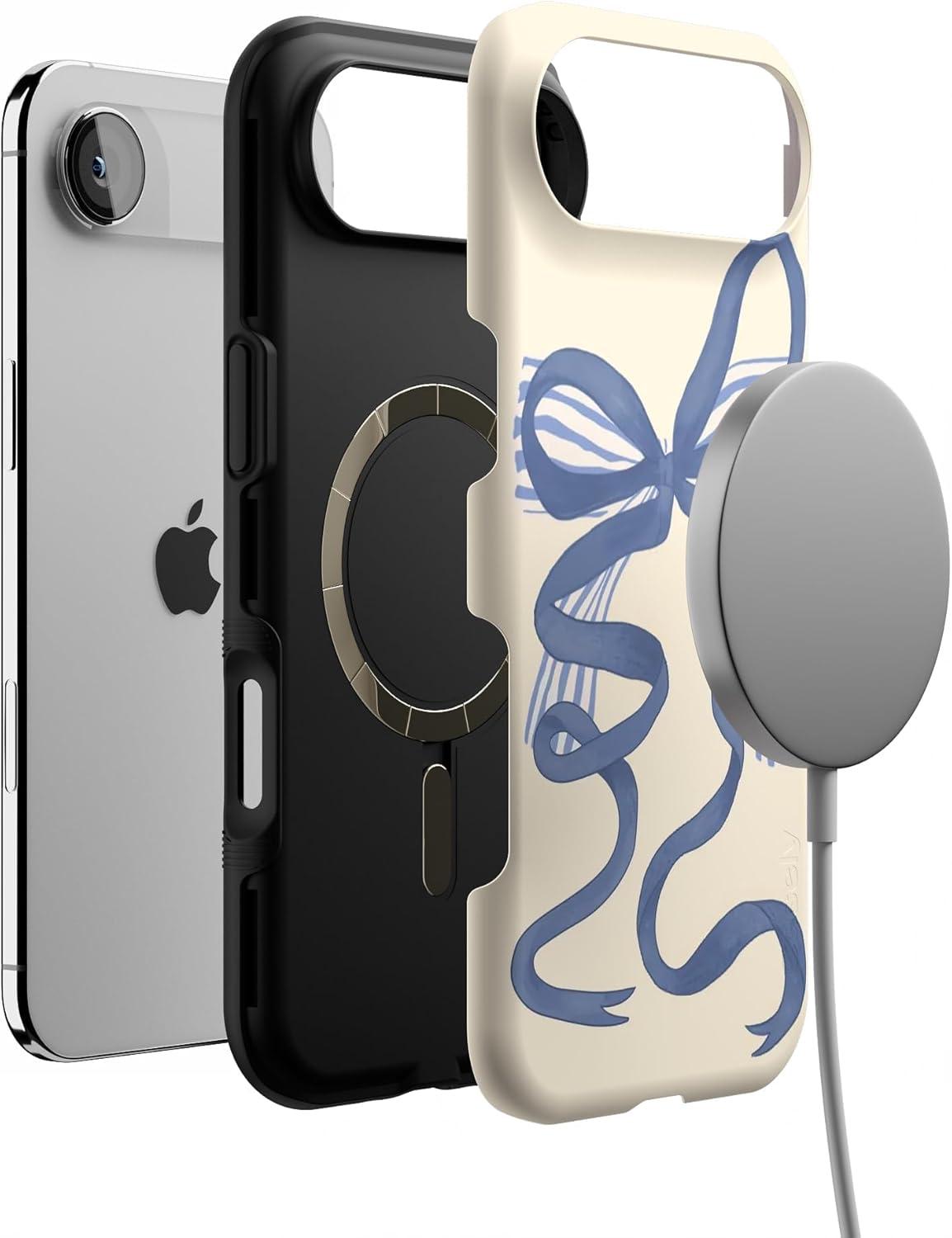 Casely iPhone 17 Air Case | Taupe on Nude | Compatible with MagSafe | Bold Protective Design(Heartstrings | Blue Bow)