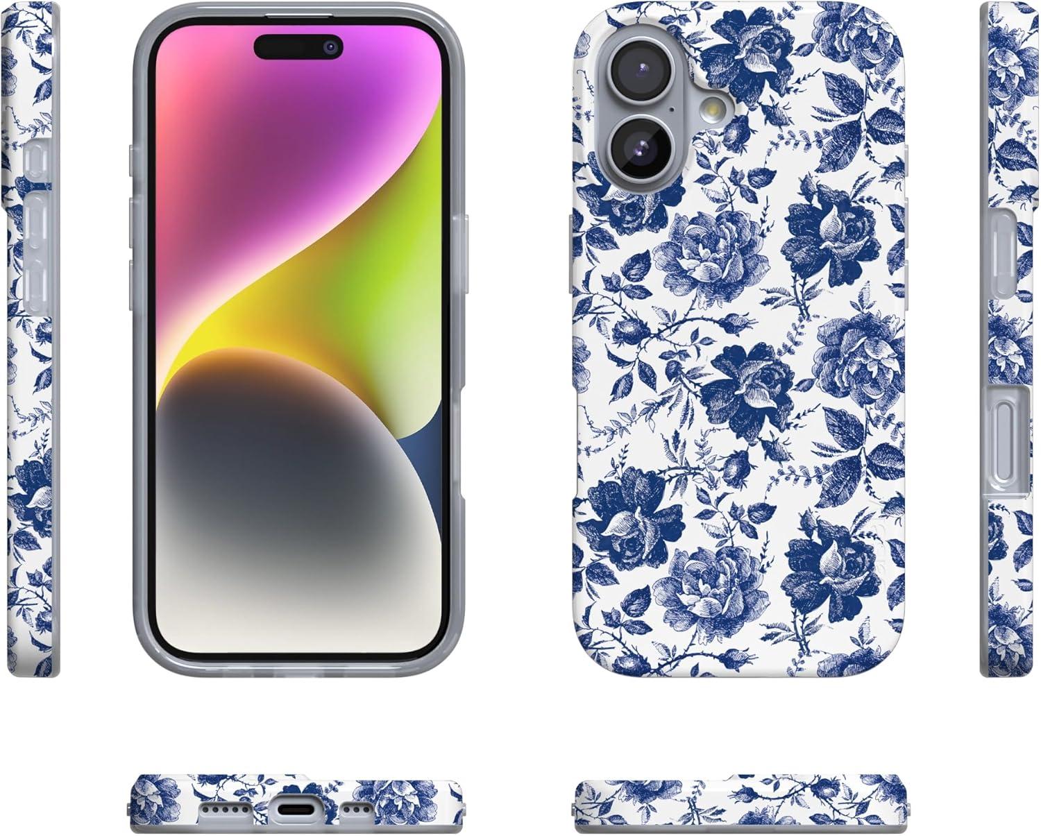 Casely iPhone 17 Case | Moody Monochrome | Bordeaux Rose | Compatible with MagSafe | Classic Ultra Thin Design(Rose to Fame | Blue & White Rose Floral)
